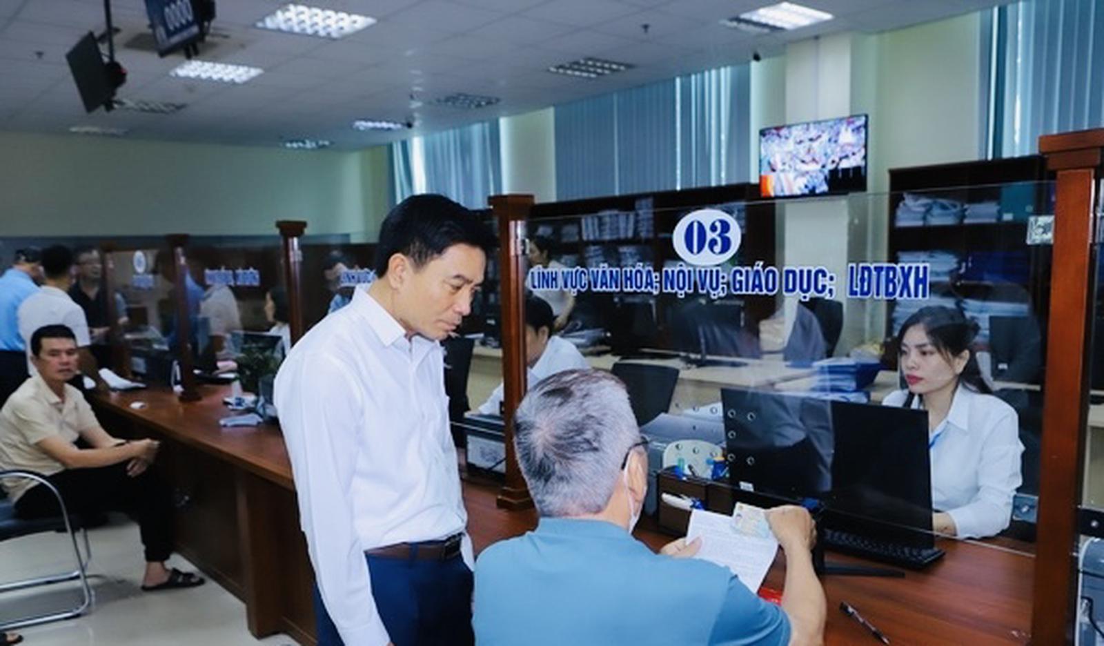 Bí thư Tỉnh ủy Nguyễn Doãn Anh nói chuyện, trao đổi với người dân xã Quảng Ninh đến làm thủ tục tại Trung tâm Phục vụ hành chính công. Ảnh: Minh Hiếu