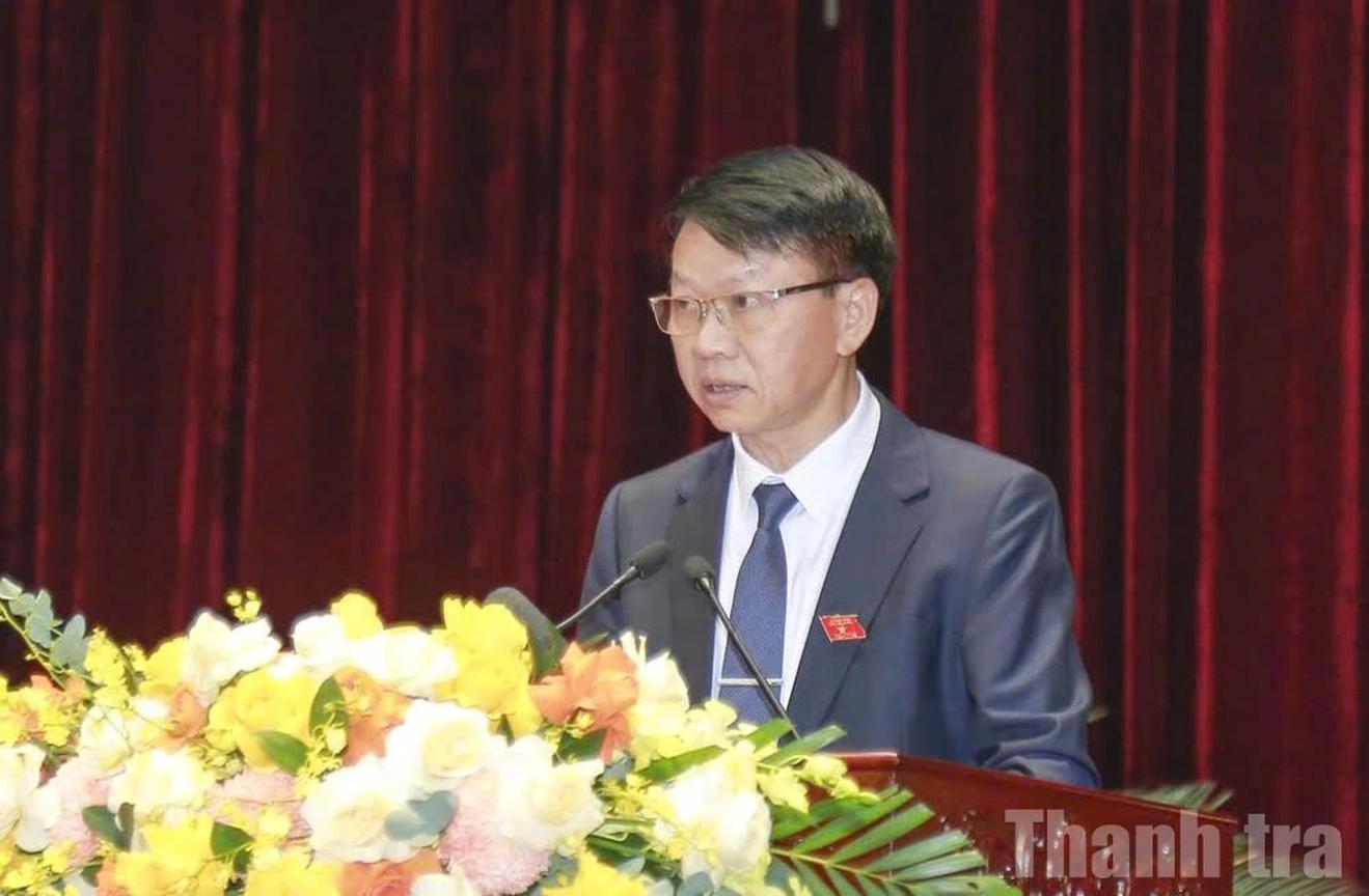 Ông Nguyễn Quốc Hải, Trưởng Ban Pháp chế HĐND tỉnh Thanh Hóa trình bày báo cáo tổng hợp kết quả thẩm tra giải quyết các ý kiến, kiến nghị của cử tri gửi đến các kỳ họp từ thứ 7 đến thứ 31. Ảnh: Văn Thanh