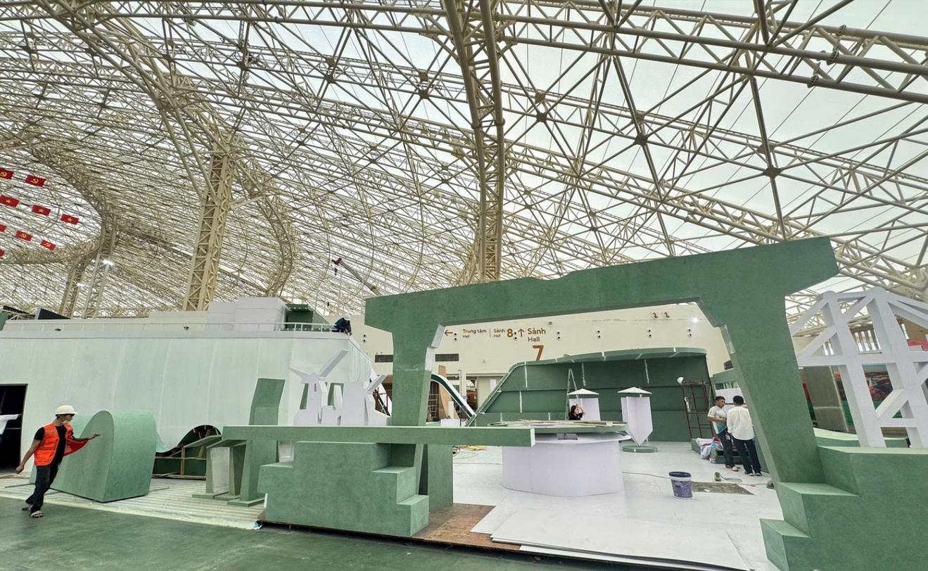 Các đơn vị thi công đang gấp rút hoàn thành trang trí khu trưng bày trong nhà. Ảnh: HT
