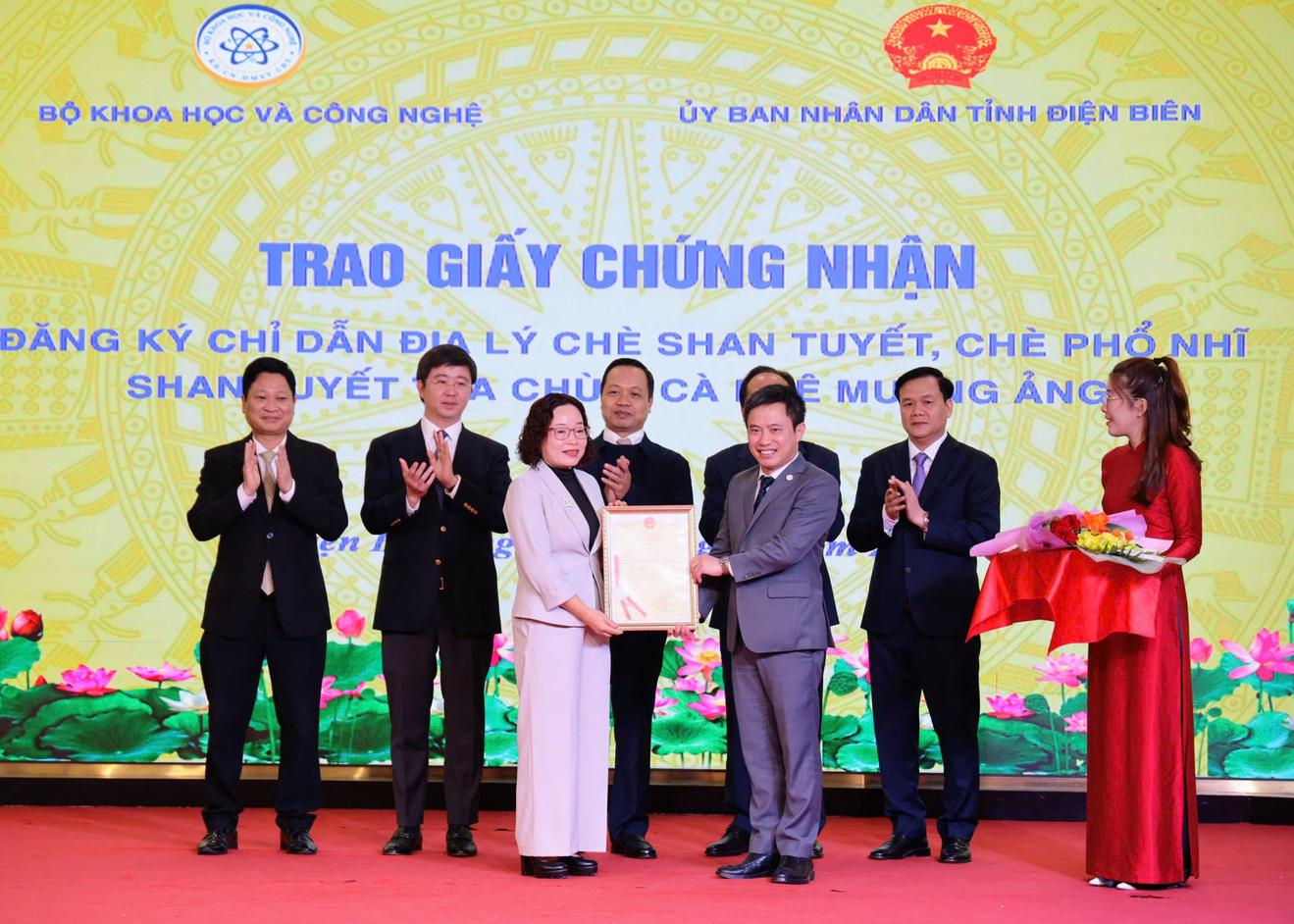 Bí thư Tỉnh uỷ Điện Biên Trần Tiến Dũng, Thứ trưởng Bùi Hoàng Phương, Phó Chủ tịch UBND tỉnh Điện Biên Nguyễn Minh Phú cùng các đại biểu chứng kiến Cục Sở hữu trí tuệ trao Giấy chứng nhận Chỉ dẫn địa lý cho Sở Nông nghiệp và Môi trường tỉnh Điện Biên. Ảnh: Ngọc Thuỷ