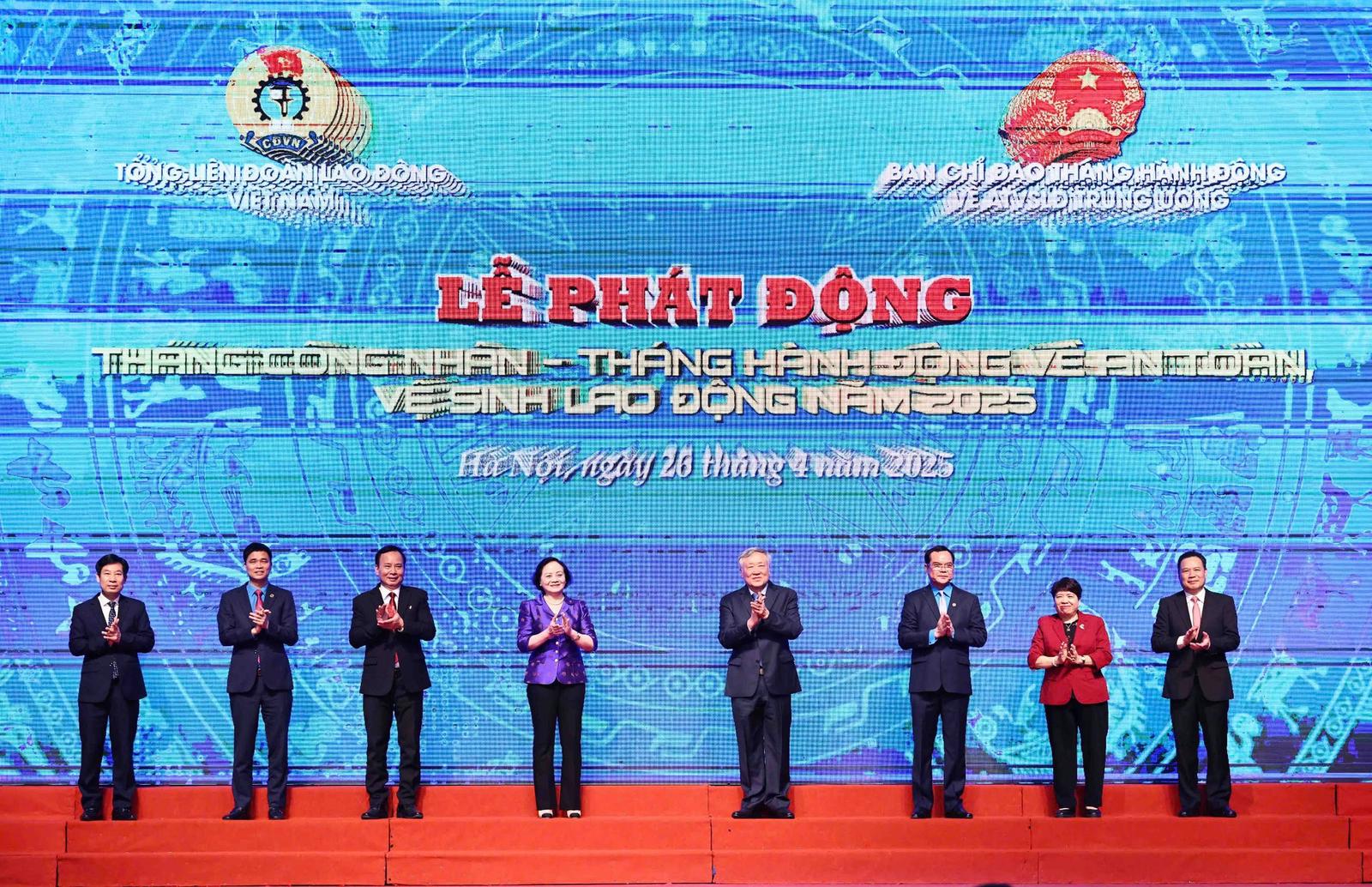 Phó Thủ tướng Thường trực Chính phủ Nguyễn Hòa Bình và các đại biểu thực hiện nghi thức phát động Tháng Công nhân và Tháng hành động về an toàn vệ sinh lao động năm 2025 - Ảnh: VGP/Nguyễn Hoàng