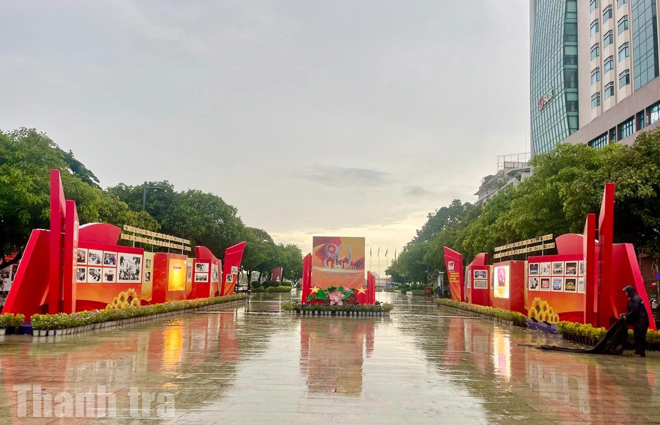Một góc đường phố rực rỡ cờ, băng rôn, khẩu hiệu mừng Quốc khánh. Ảnh: Thu Huyền