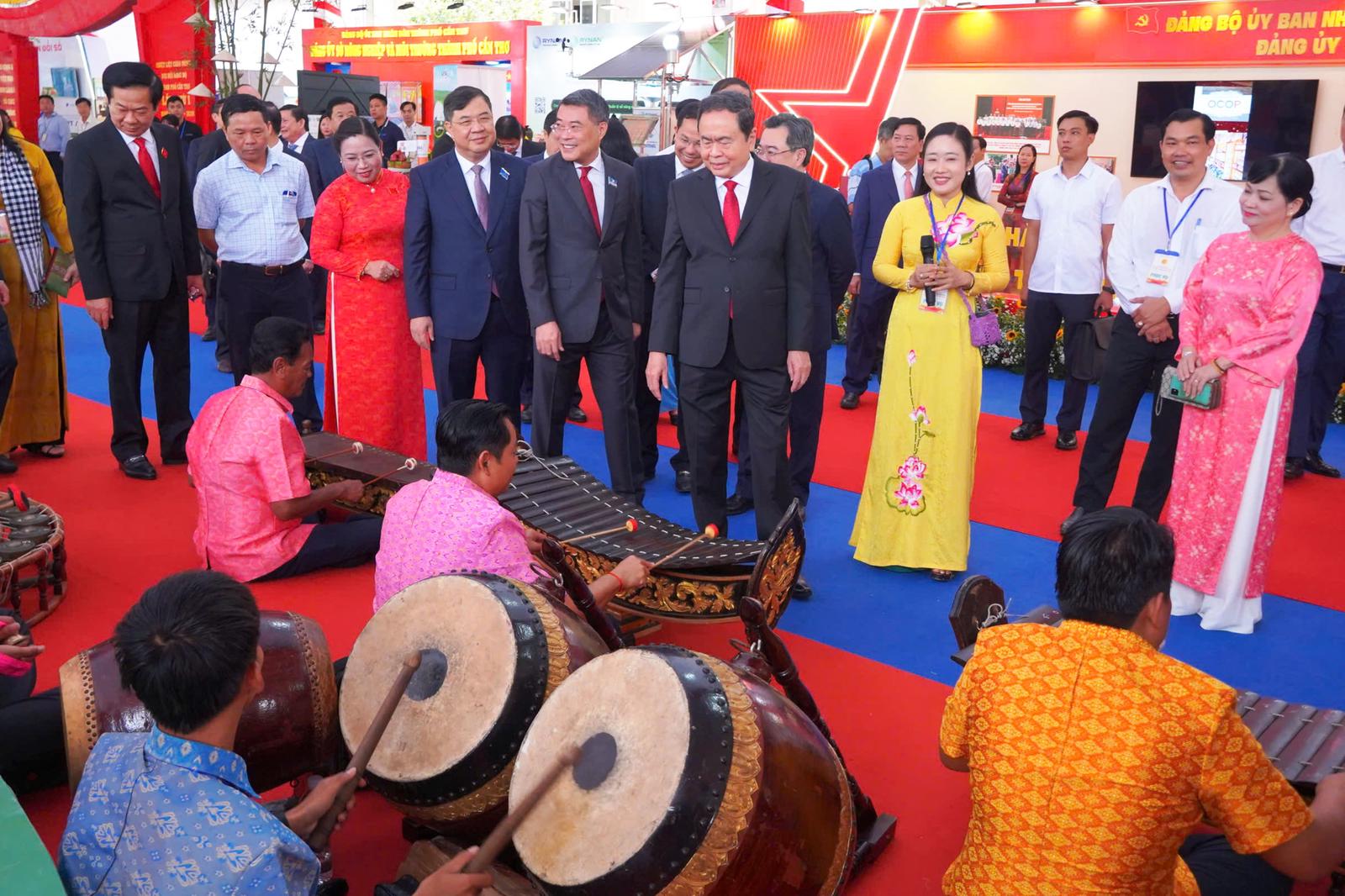 Chủ tịch Quốc hội Trần Thanh Mẫn và các đồng chí lãnh đạo tham quan và thưởng thức biểu diễn nhạc cụ truyền thống. Ảnh: Phạm Thúy
