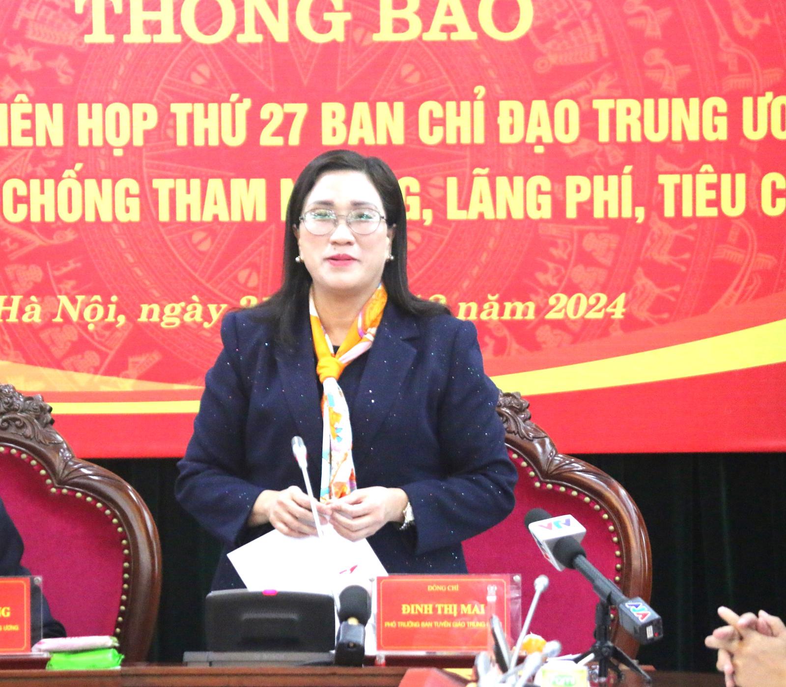 Ông Đặng Văn Dũng, Phó trưởng Ban Nội chính Trung ương; bà Đinh Thị Mai, Phó Trưởng Ban Tuyên giáo Trung ương; Thiếu tướng Hoàng Anh Tuyên, Phó Chánh văn phòng Bộ Công an, đồng chủ trì buổi thông báo kết quả phiên họp thứ 27 của Ban Chỉ đạo Trung ương về phòng, chống tham nhũng, lãng phí, tiêu cực. Ảnh: Hoàng Nam