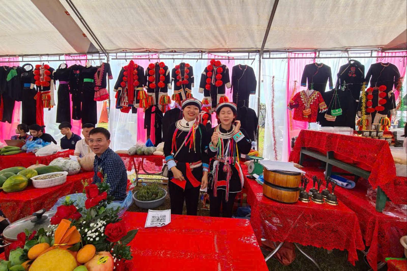 Những cô gái người Dao bên gian hàng giới thiệu sản phẩm đặc trưng của xã Đường Hồng. Ảnh: Bùi Bình