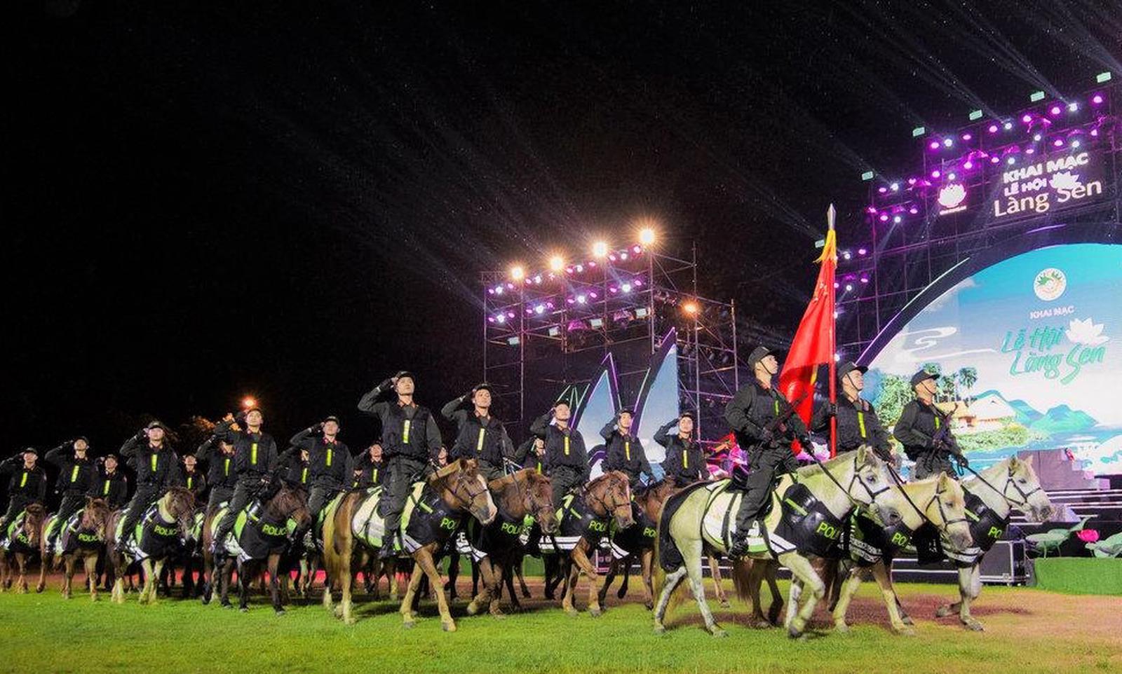 Đoàn Cảnh sát cơ động kỵ binh thuộc Bộ Tư lệnh Cảnh sát Cơ động, Bộ Công an diễn hành qua sân khấu. Ảnh: NTV