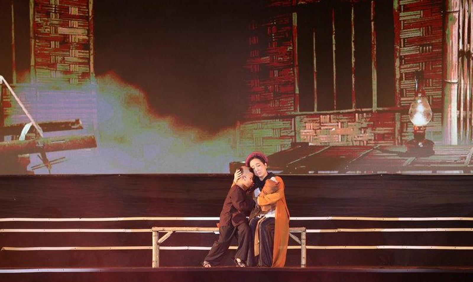 Hoạt cảnh dân ca ví giặm do NSND Hồng Lựu và bé Công Minh biểu diễn tái hiện về những năm tháng đầy mất mát trong thời niên thiếu của Người. Ảnh: Châu Yên