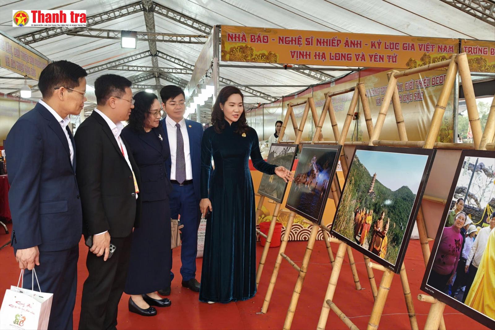 Bà Nguyễn Thị Hạnh, Phó Chủ tịch UBND tỉnh Quảng Ninh tham quan không gian trưng bày ảnh nghệ thuật về Vịnh Hạ Long và Yên Tử bên lề lễ hội. Ảnh: Thành Nguyễn