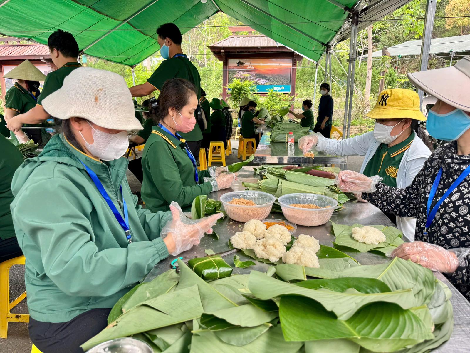 Những suất ăn buổi trưa được chuẩn bị và trao đến các phật tử và Nhân dân về Chiêm bái Xá lợi Phật tại Yên Tử. Ảnh: PV