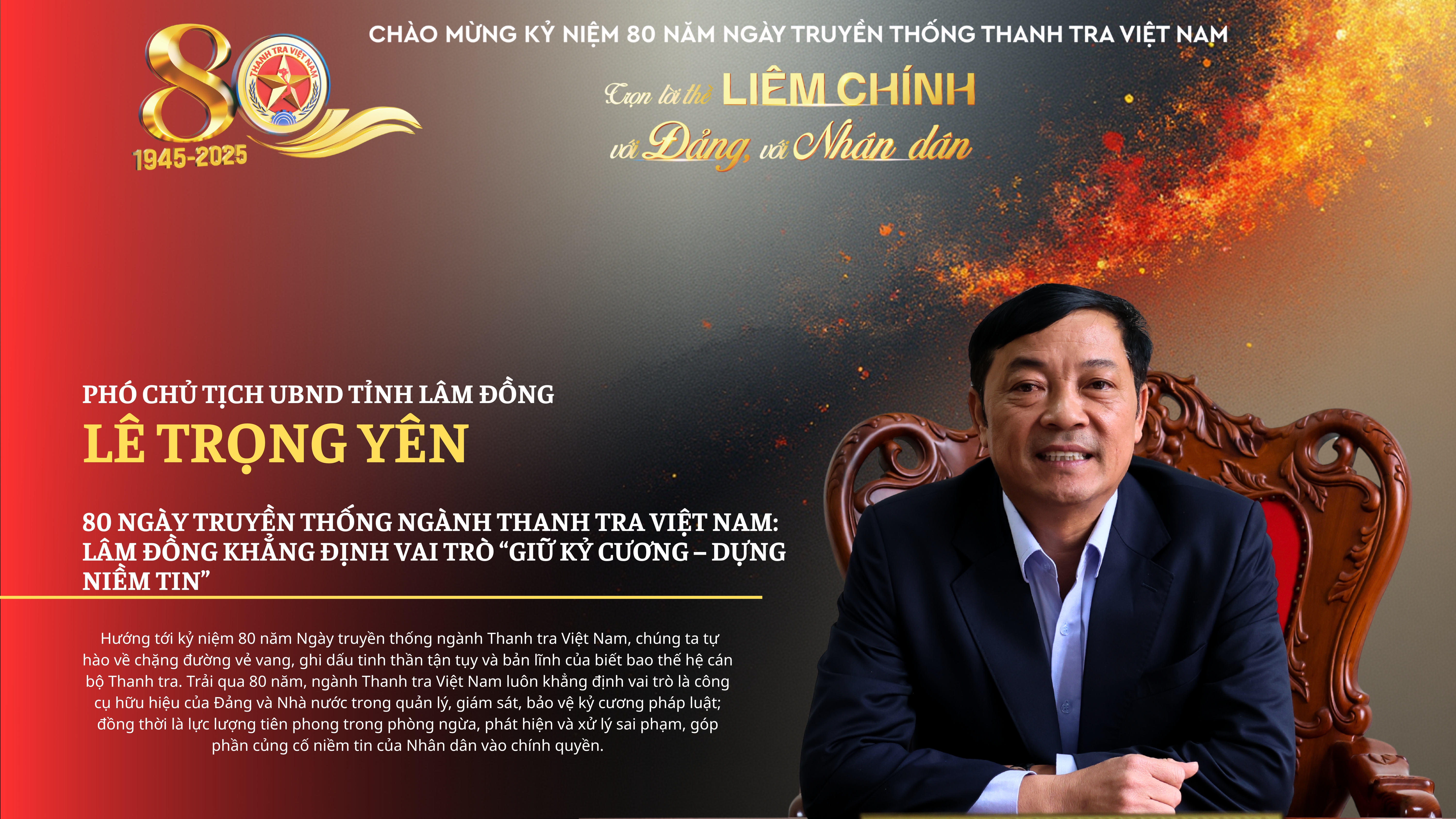 Nhân kỷ niệm 80 năm Ngày truyền thống Thanh tra Việt Nam, Báo Thanh tra có cuộc phỏng vấn ông Lê Trọng Yên, Phó Chủ tịch UBND tỉnh Lâm Đồng. Cuộc trao đổi đi sâu vào vai trò của ngành Thanh tra trong bối cảnh mới; kết quả nổi bật trong thanh tra, tiếp công dân, phòng chống tham nhũng; cùng những định hướng tái cấu trúc hệ thống thanh tra theo mô hình chính quyền hai cấp.