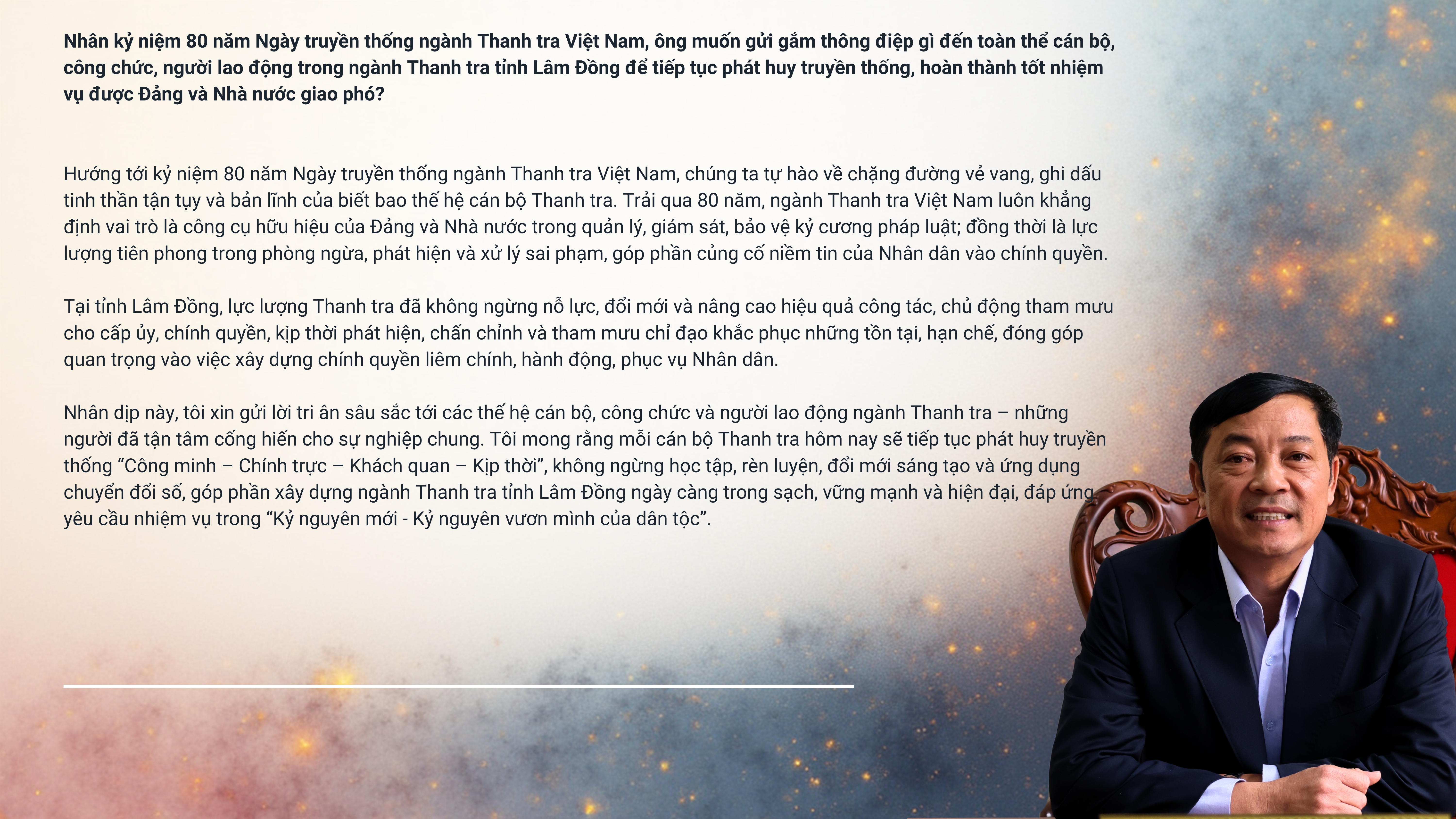 +Thưa ông, 80 năm Ngày truyền thống ngành Thanh tra Việt Nam là dịp nhìn lại chặng đường hình thành và phát triển. Ông đánh giá như thế nào về vai trò của ngành Thanh tra trong quản lý nhà nước, đặc biệt tại Lâm Đồng?