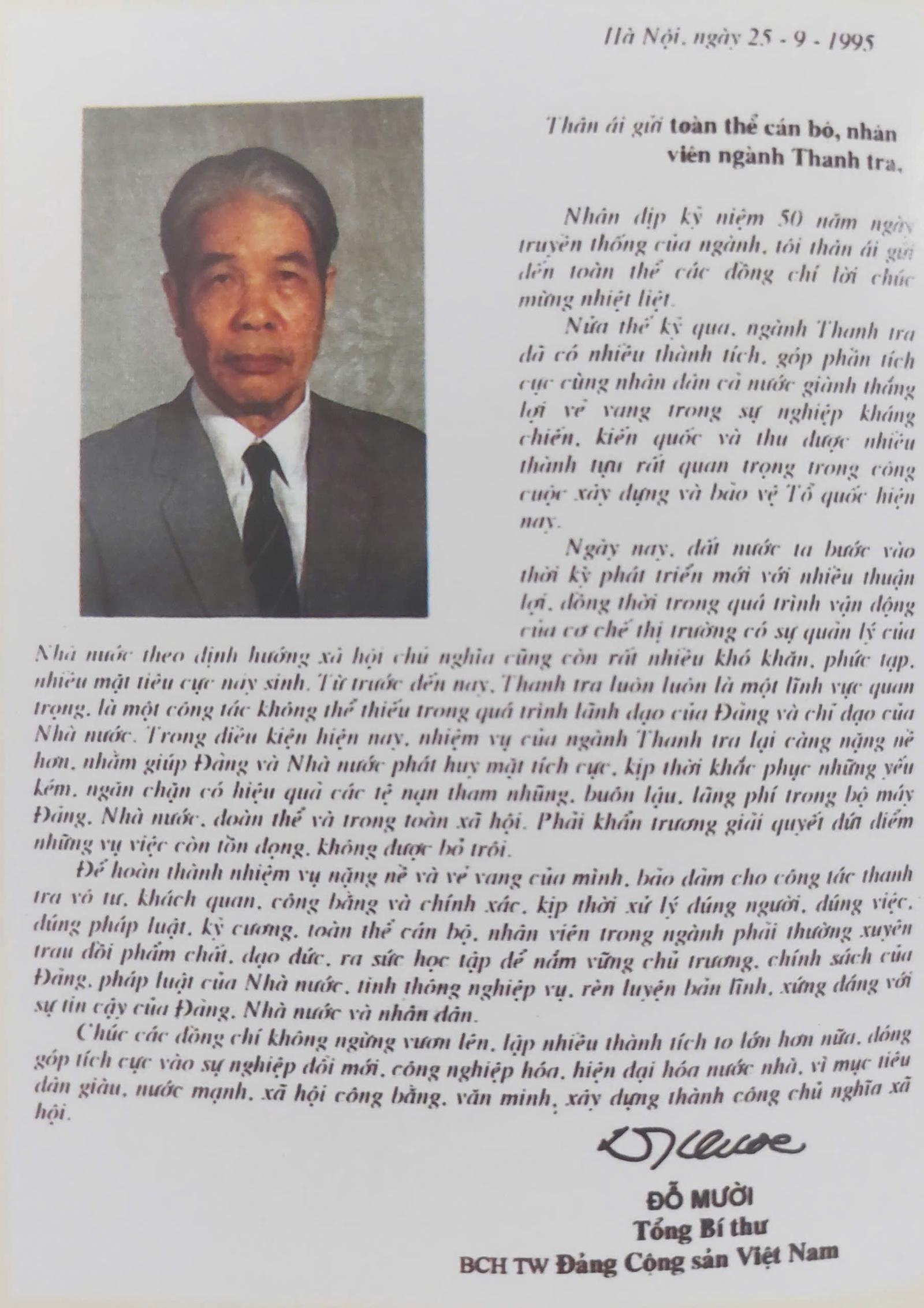 Nhân dịp kỷ niệm 50 Ngày truyền thống Thanh tra Việt Nam (năm 1995), Tổng Bí thư Đỗ Mười đã có thư chúc mừng gửi tới toàn thể cán bộ, nhân viên ngành Thanh tra.