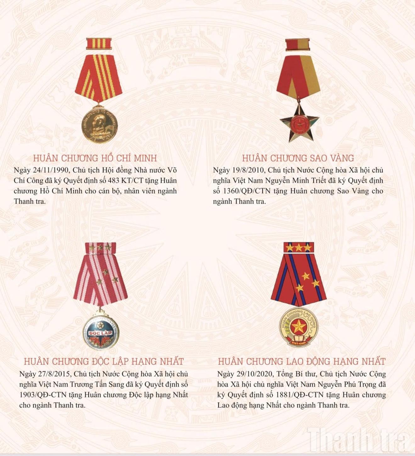Trong 80 năm xây dựng và phát triển, ngành Thanh tra Việt Nam tự hào về bề dày thành tích và truyền thống vẻ vang đã được Đảng, Nhà nước ghi nhận trao tặng các phần thưởng cao quý, như: Huân chương Hồ Chí Minh (1990), Huân chương Sao Vàng (2010), Huân chương Độc lập hạng Nhất (2015), Huân chương Lao động hạng Nhất (2020)… và nhiều phần thưởng cao quý khác.