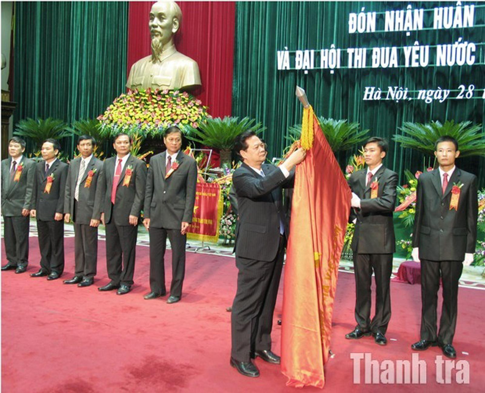 Đồng chí Nguyễn Tấn Dũng, Thủ tướng Chính phủ gắn Huân chương Sao Vàng lên lá cờ truyền thống ngành Thanh tra nhân Lễ kỷ niệm 65 năm Ngày Truyền thống Thanh tra Việt Nam. Ảnh: Tư liệu/Báo Thanh tra
