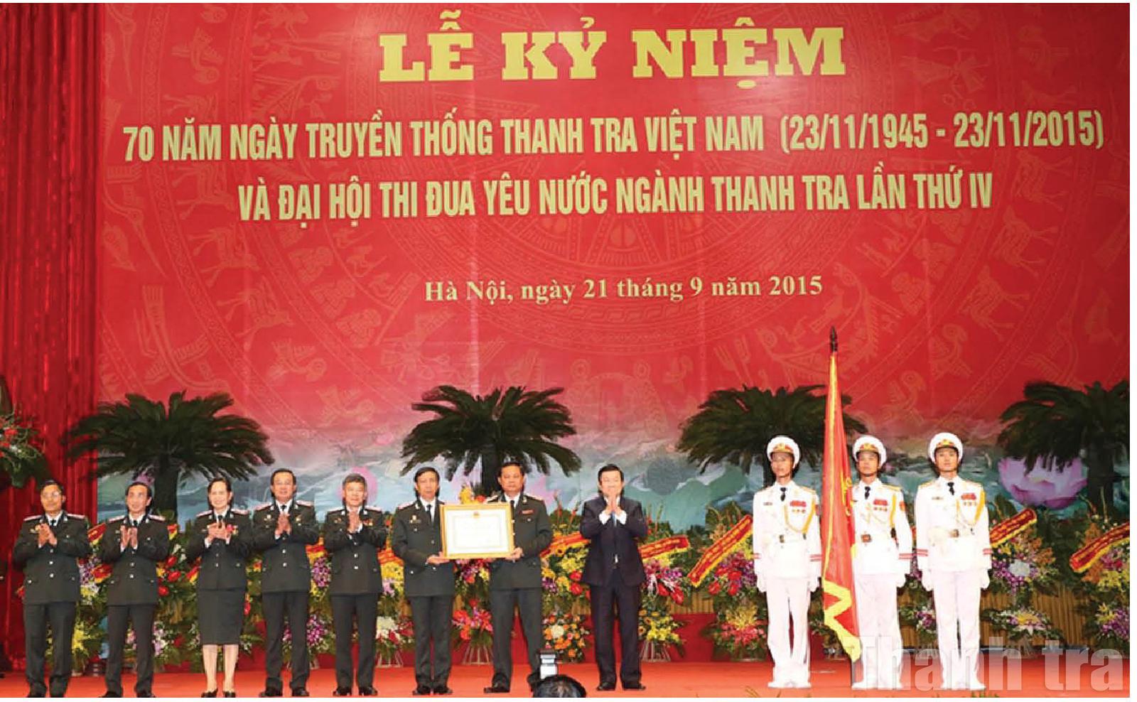 Tại Lễ kỷ niệm 70 năm Ngày Truyền thống Thanh tra Việt Nam (23/11/1945 - 23/11/2015) và Đại hội Thi đua yêu nước ngành Thanh tra lần thứ IV, thay mặt Đảng, Nhà nước, Chủ tịch nước Trương Tấn Sang đã trao tặng ngành Thanh tra Việt Nam Huân chương Độc lập hạng Nhất. Ảnh: Tư liệu/Báo Thanh tra