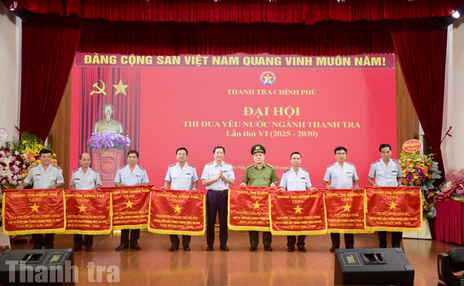 Phó Tổng Thanh tra Chính phủ Dương Quốc Huy trao Cờ thi đua của Thanh tra Chính phủ cho các tập thể xuất sắc trong phong trào thi đua. Ảnh: Huy Trần