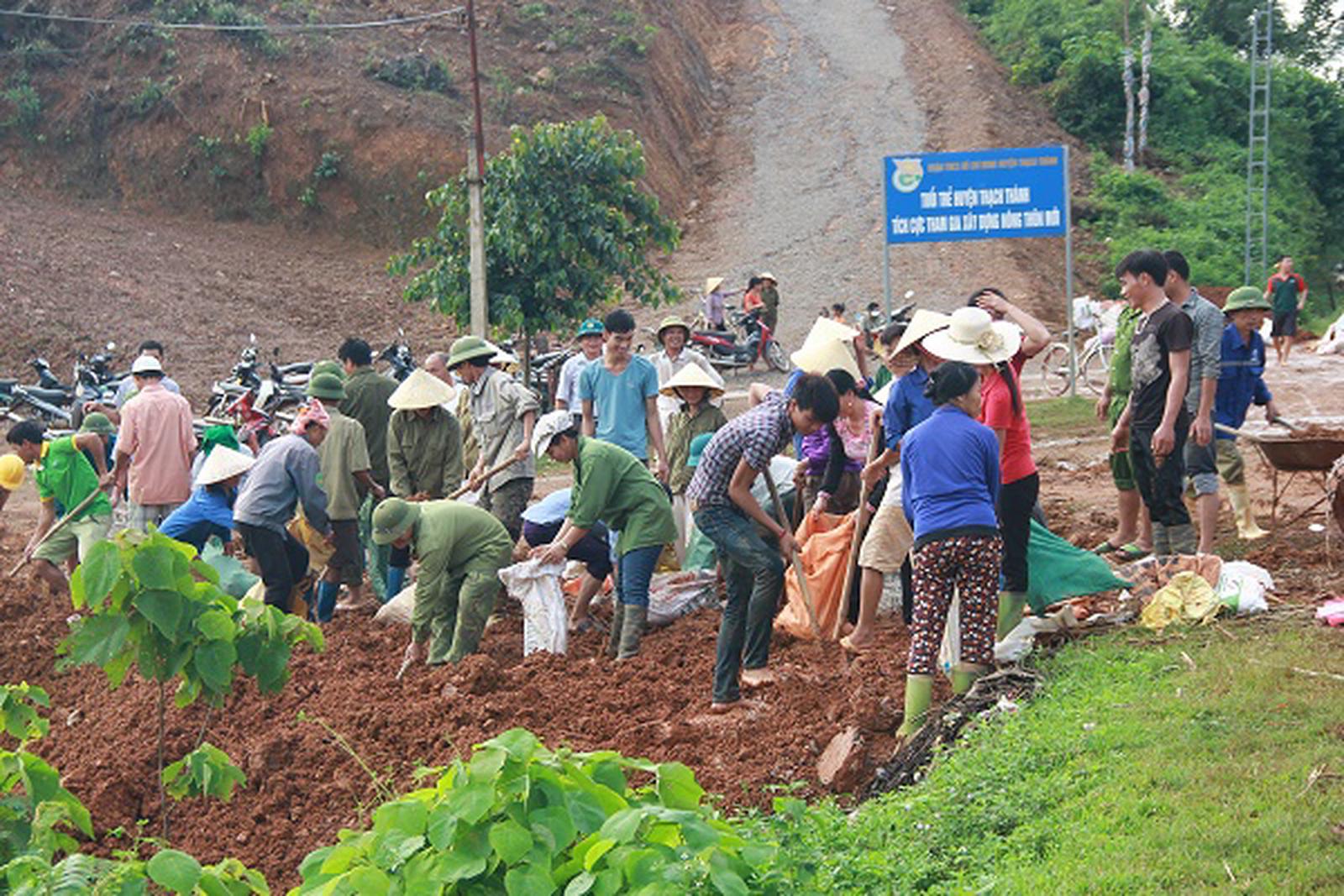 Chính quyền, người dân cùng đồng hành để chống lũ ở huyện Thạch Thành. Ảnh: Văn Thanh