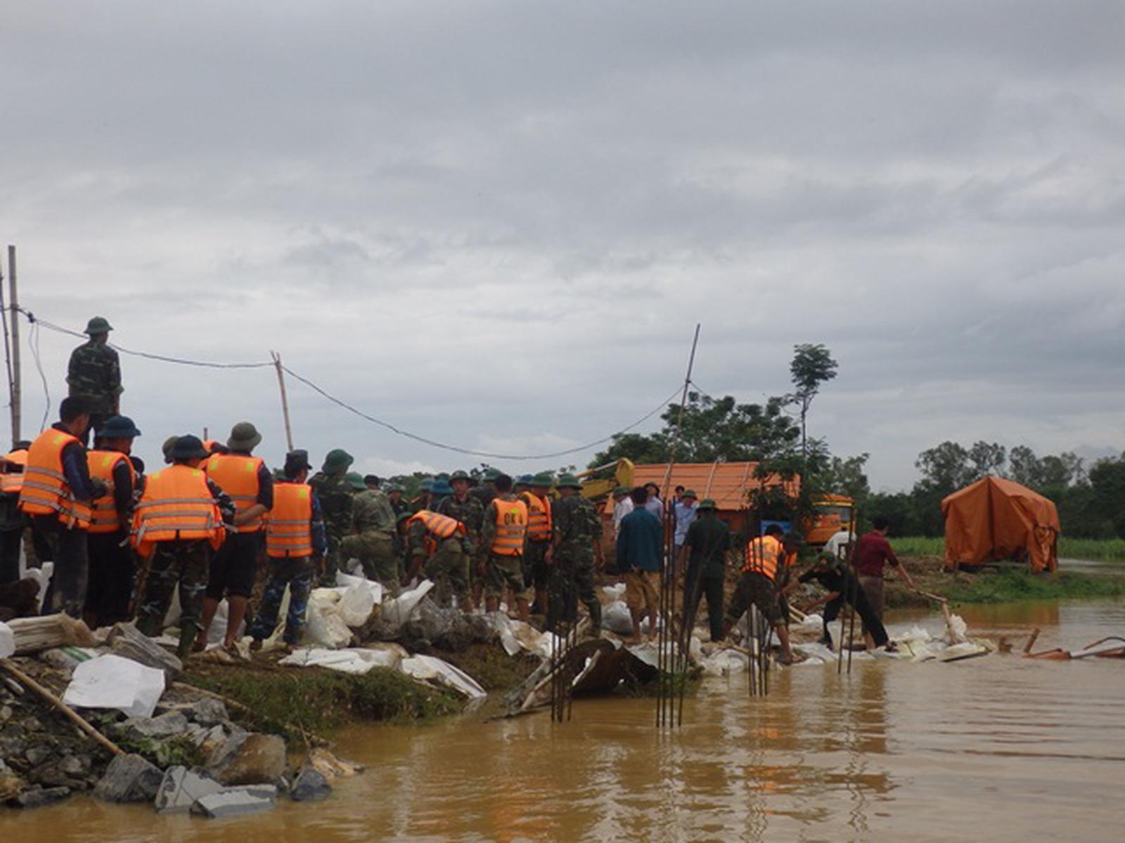 Lực lượng chức năng nỗ lực ngăn chặn nước để cứu đê ở sông Cầu Chày. Ảnh: Văn Thanh