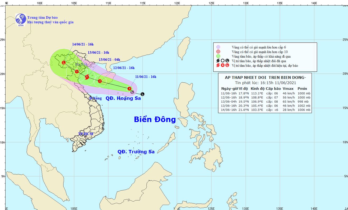 Ông Hoàng Phúc Lâm, Phó Giám đốc Trung tâm Dự báo khí tượng thủy văn cho biết, lúc 16 giờ chiều nay, vị trí tâm áp thấp nhiệt đới ở vào khoảng 17,8 độ Vĩ Bắc; 113,1 độ Kinh Đông. Cường độ áp thấp nhiệt đới mạnh cấp 6, giật cấp 8.