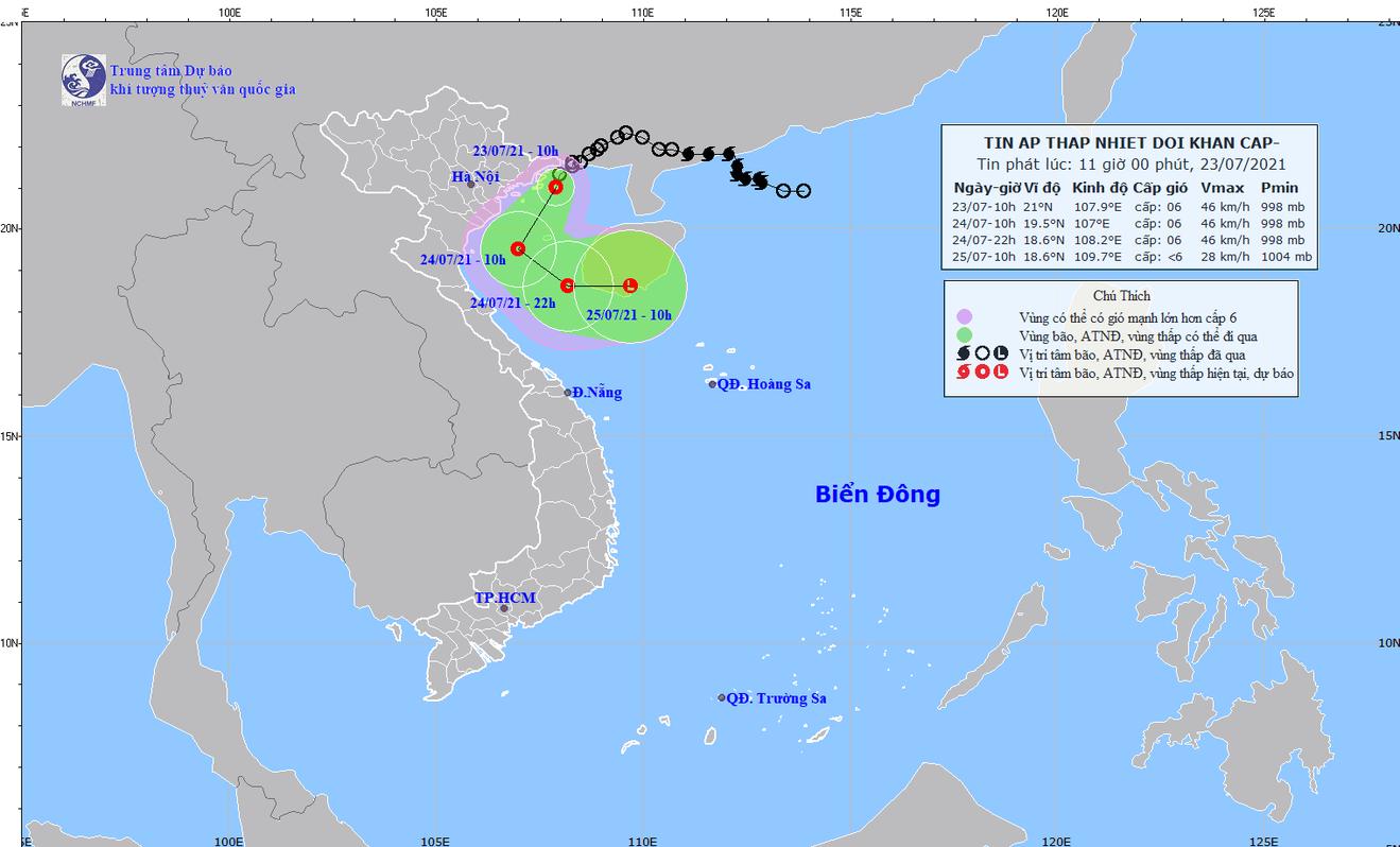 (Thanh tra) - Trung tâm Khí tượng Thủy văn Quốc gia cho biết, hồi 10 giờ ngày 23/7, vị trí tâm áp thấp nhiệt đới ở khoảng 21 độ Vĩ Bắc; 107,9 độ Kinh Đông, ngay trên vùng biển tỉnh Quảng Ninh.