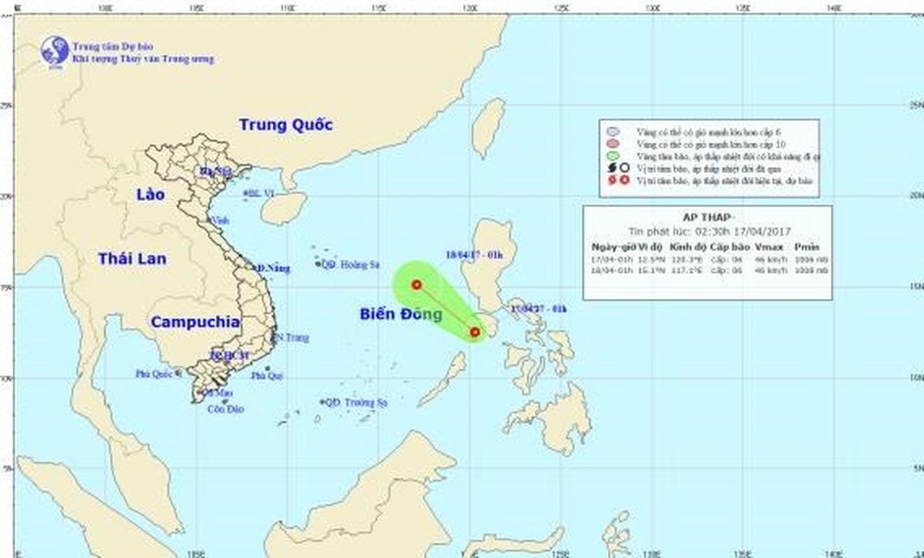 Dự báo trong 24 giờ tới, áp thấp nhiệt đới di chuyển theo hướng Tây Bắc, mỗi giờ đi được khoảng 15-20km. Đến 1 giờ ngày 18/4, vị trí tâm áp thấp nhiệt đới ở vào khoảng 15,1 độ Vĩ Bắc; 117,1 độ Kinh Đông. Sức gió mạnh nhất ở vùng gần tâm áp thấp nhiệt đới mạnh cấp 6 (40-50km/giờ), giật cấp 7-8.