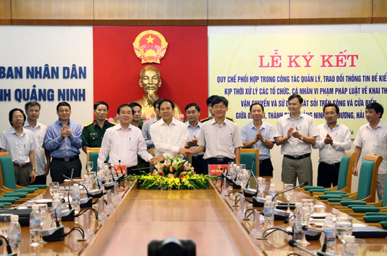 (Thanh tra)- Vừa qua, tại TP Hạ Long, UBND tỉnh Quảng Ninh, TP Hải Phòng và tỉnh Hải Dương thực hiện ký kết Quy chế phối hợp quản lý, trao đổi thông tin cùng kiểm tra, xử lý kịp thời các hành vi vi phạm pháp luật về khai thác, vận chuyển và sử dụng cát sỏi trên sông và cửa biển giữa các tỉnh và TP nói trên.