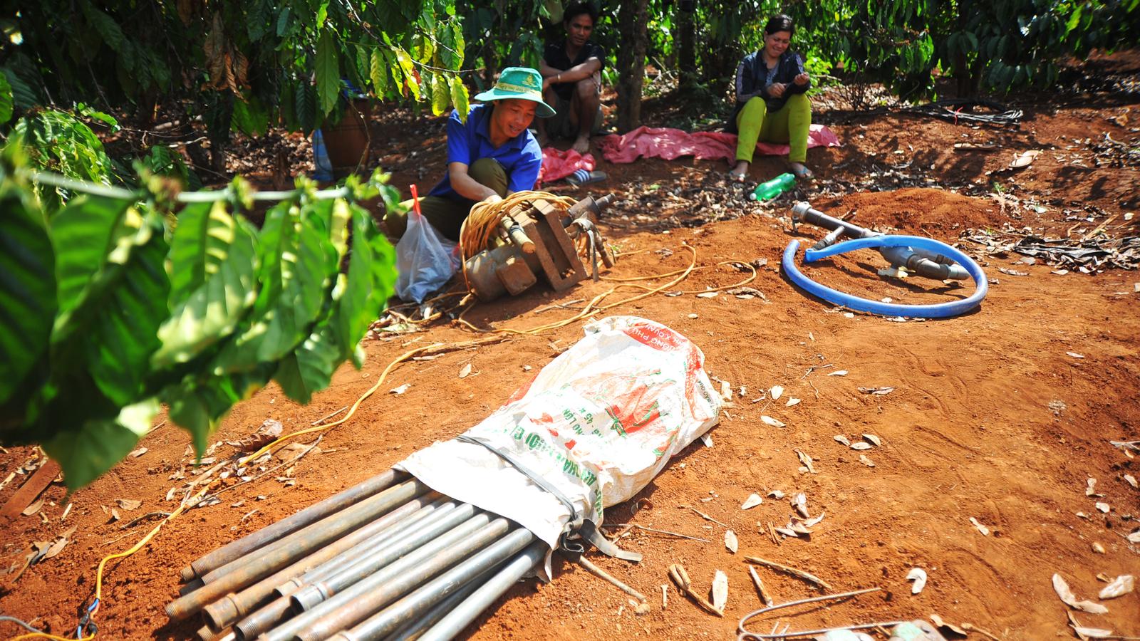 Nông dân huyện Ia Grai chuẩn bị nguồn nước và đầu tư hệ thống tưới tiết kiệm thích ứng với tình hình hạn hán kéo dài thời gian tới. Ảnh: N.G