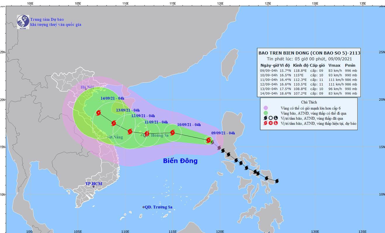 Dự báo trong 24 giờ tới, bão di chuyển theo hướng Tây Tây Bắc, mỗi giờ đi được 15-20km và có khả năng mạnh thêm. Đến 04 giờ ngày 10/9, vị trí tâm bão ở khoảng 16,5 độ Vĩ Bắc; 115 độ Kinh Đông, cách quần đảo Hoàng Sa khoảng 350km về phía Đông. Sức gió mạnh nhất vùng gần tâm bão mạnh cấp 10 (90-100km/giờ), giật cấp 12.