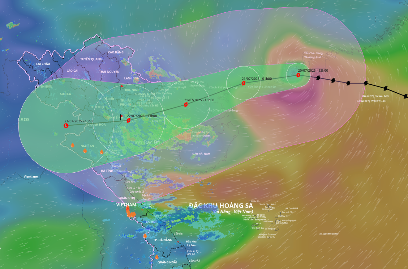Hồi 13 giờ trưa 20/7, tâm bão trên vùng biển phía bắc khu vực Bắc Biển Đông, cách Quảng Ninh - Hải Phòng khoảng 630km về phía Đông, bão đã mạnh lên cấp 12 (118-133km/giờ), giật cấp 15.