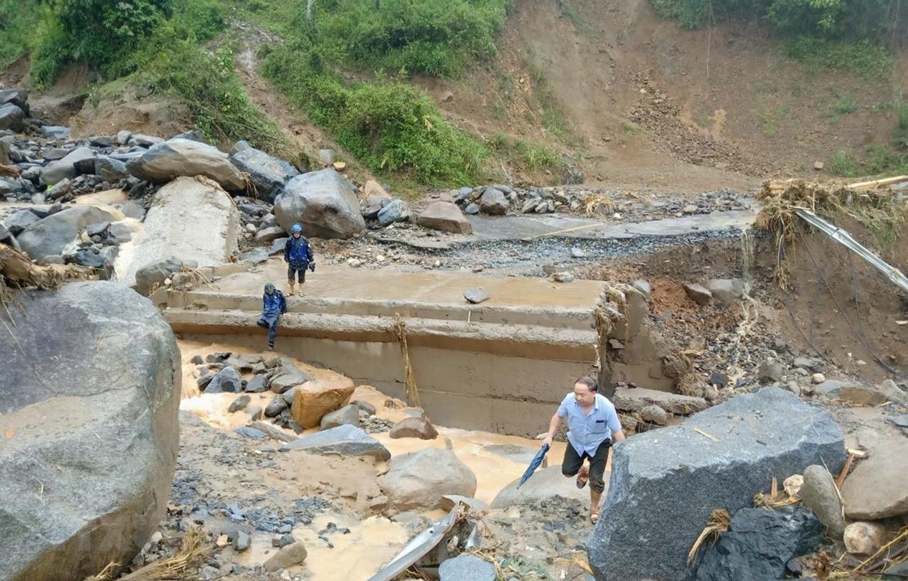 Quốc lộ 15C đoạn qua bản Pá Hộc, xã Nhi Sơn lên trung tâm huyện Mường Lát, tỉnh Thanh Hóa bị đứt gãy làm đôi, khiến giao thông tê liệt hoàn toàn. (Ảnh: Hoa Mai/TTXVN)