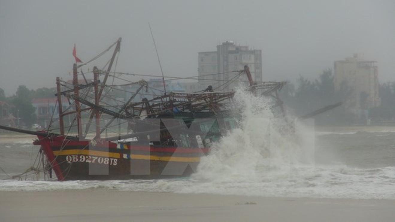 Một tàu cá bị mắc cạn, có nguy cơ bị sóng đánh chìm tại cửa biển Nhật Lệ, thành phố Đồng Hới, tỉnh Quảng Bình. (Ảnh: TTXVN)