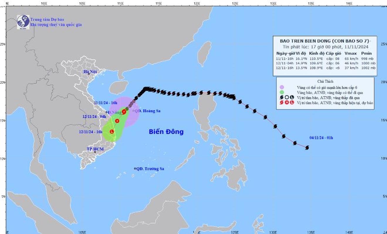 Theo Trung tâm Dự báo khí tượng thủy văn Quốc gia, lúc 16 giờ ngày 11/11, vị trí tâm bão số 7 ở vào khoảng 16,1 độ Vĩ Bắc; 110,5 độ Kinh Đông, trên vùng biển phía Tây Bắc vùng biển Hoàng Sa. Sức gió mạnh nhất vùng gần tâm bão mạnh cấp 8 (62-74 km/h), giật cấp 10. Bão số 7 di chuyển theo hướng Tây Nam, tốc độ 15-20 km/h.