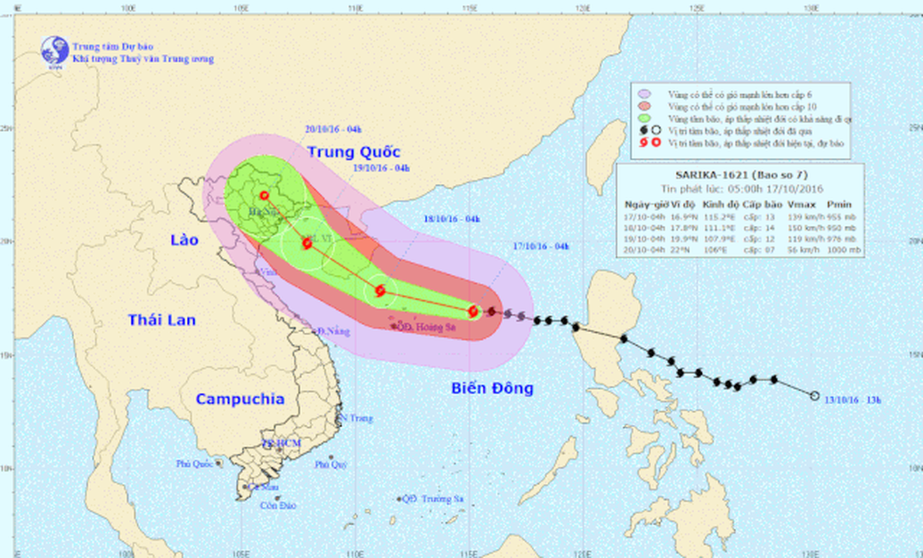 Hồi 4h ngày 17/10, vị trí tâm bão ở vào khoảng 16,9 độ Vĩ Bắc; 115,2 độ Kinh Đông, cách quần đảo Hoàng Sa khoảng 320km về phía Đông. Sức gió mạnh nhất ở vùng gần tâm bão mạnh cấp 13 (135-150km/giờ), giật cấp 16.