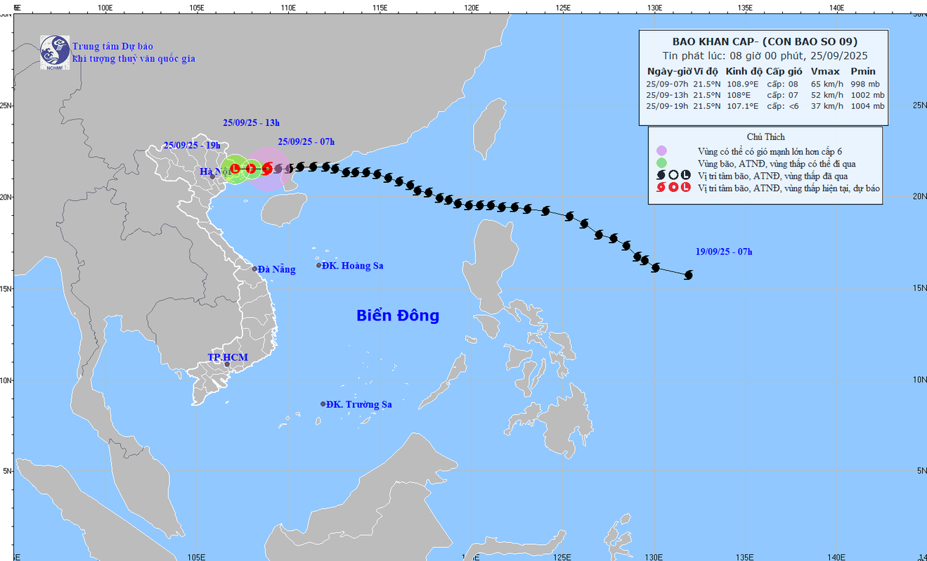 Dự báo trong ngày hôm nay, bão di chuyển theo hướng Tây với tốc độ khoảng 20km/h, đi vào đất liền nước ta ở khu vực Quảng Ninh khoảng trưa nay và suy yếu dần thành áp thấp nhiệt đới.
