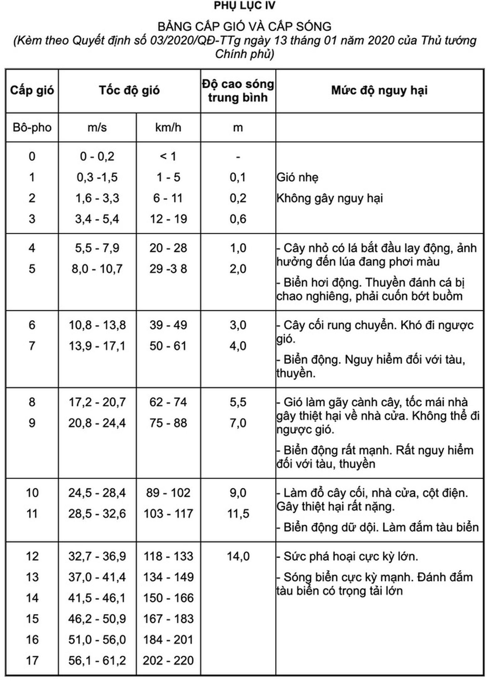 Bảng cấp gió và cấp sóng cho thấy cấp gió 11 có thể làm đổ cây cối, nhà cửa, cột điện, gây thiệt hại rất nặng, biển động dữ đội, làm đắm tàu thuyền; cấp gió 12-13 có thể có sức phá hoại cực kỳ lớn, sóng biển cực kỳ mạnh, đánh đắm tàu biển trọng tải lớn