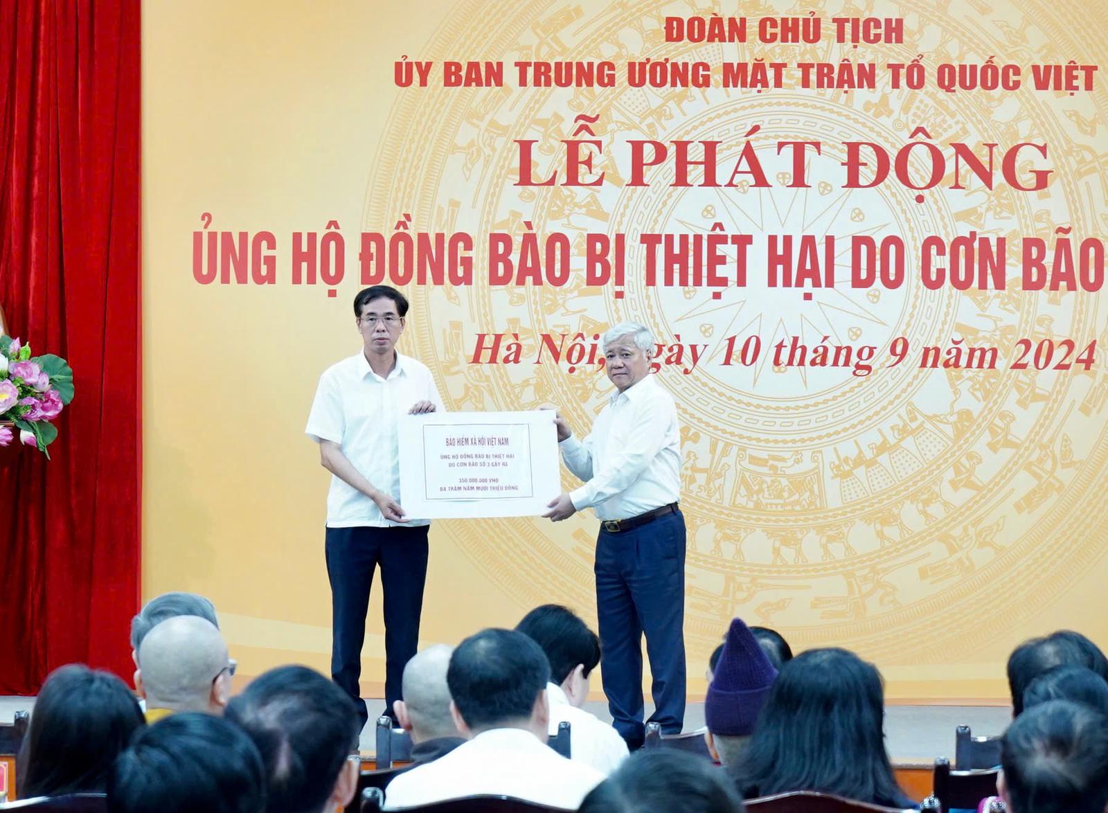 Từ số tiền quyên góp trực tiếp tại Lễ phát động, chiều cùng ngày, tại Lễ Trao tặng Quỹ ủng hộ đồng bào bị thiệt hại do cơn bão số 3 gây ra của Ủy ban Trung ương Mặt trận Tổ quốc Việt Nam, Phó Tổng Giám đốc Đào Việt Ánh thay mặt ngành BHXH Việt Nam tới trao số tiền 350 triệu đồng để chung tay giúp đỡ người dân vùng bão lũ sớm khắc phục hậu quả thiên tai./.
