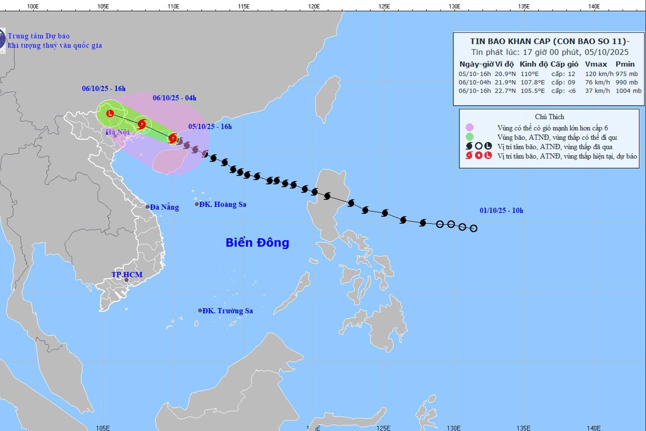 Trung tâm Dự báo khí tượng thủy văn Quốc gia chiều 5/10 cho biết, hồi 17h chiều nay (5/10), vị trí tâm bão ở vào khoảng 21.0 độ Vĩ Bắc; 109.8 độ Kinh Đông, cách Móng Cái (Quảng Ninh) khoảng 210km về phía Đông Đông Nam.