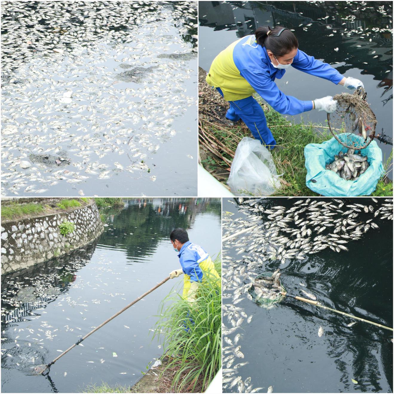 Trước diễn biến này, nhằm giảm thiểu mùi hôi thối cũng như ô nhiễm từ nguồn nước, giảm khả năng phân hủy của cá thể cá bị chết, trong sáng nay, chính quyền phường Cửa Nam, phường Đội Cung phối hợp Công ty Cổ phần Quản lý và Phát triển hạ tầng đô thị TP Vinh đã trực tiếp huy động nhân lực, phối hợp với đơn vị vệ sinh môi trường tổ chức vớt cá chết nổi trên mặt kênh để tập kết, rắc vôi bột khử trùng, khử mùi để tiến hành tiêu hủy, chôn lấp.
