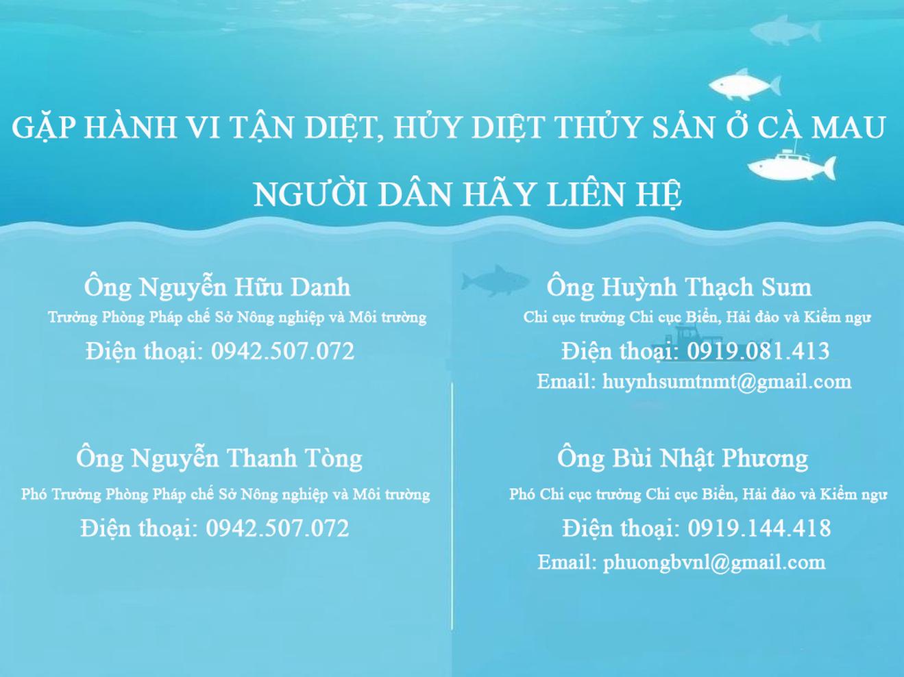 Theo thông báo của Sở Nông nghiệp và Môi trường, tổ chức, cá nhân có thể liên hệ các số điện thoại dưới đây để phản ánh, tố giác các hành vi khai thác nguồn lợi thủy sản có tính hủy diệt, tận diệt: Trưởng Phòng Pháp chế Sở Nông nghiệp và Môi trường Nguyễn Hữu Danh (điện thoại: 0942.507.072); Phó trưởng Phòng Pháp chế Sở Nông nghiệp và Môi trường Nguyễn Thanh Tòng (điện thoại: 0942.507.072); Chi cục trưởng Chi cục Biển, Hải đảo và Kiểm ngư Huỳnh Thạch Sum (điện thoại: 0919.081.413; email: huynhsumtnmt@gmail.com); Phó Chi cục trưởng Chi cục Biển, Hải đảo và Kiểm ngư Bùi Nhật Phương (điện thoại: 0919.144.418; email: phuongbvnl@gmail.com).