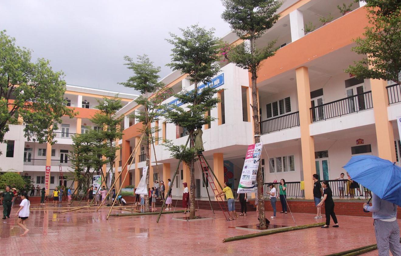 Phụ huynh Trường Tiểu học Lê Mao giúp nhà trường chằng néo cây xanh chống bão. (Ảnh: Bích Huệ/TTXVN)