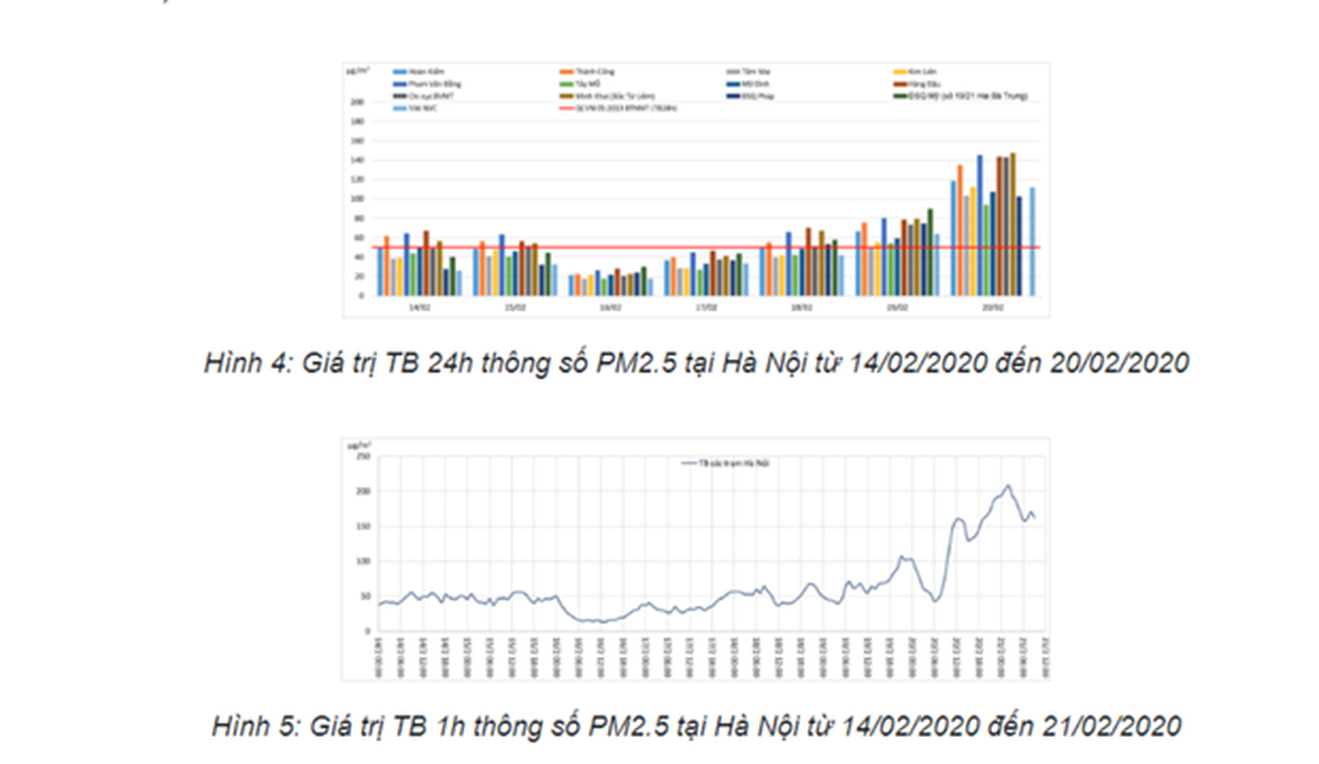 Tại Hà Nội, giá trị quan trắc trung bình 24 giờ thông số PM2.5 tại các trạm quan trắc cho thấy tháng Một, có 9 ngày vượt giới hạn cho phép tại Quy chuẩn Việt Nam. Từ ngày 1-20/2, có 11 ngày vượt giới hạn cho phép theo Quy chuẩn Việt Nam.