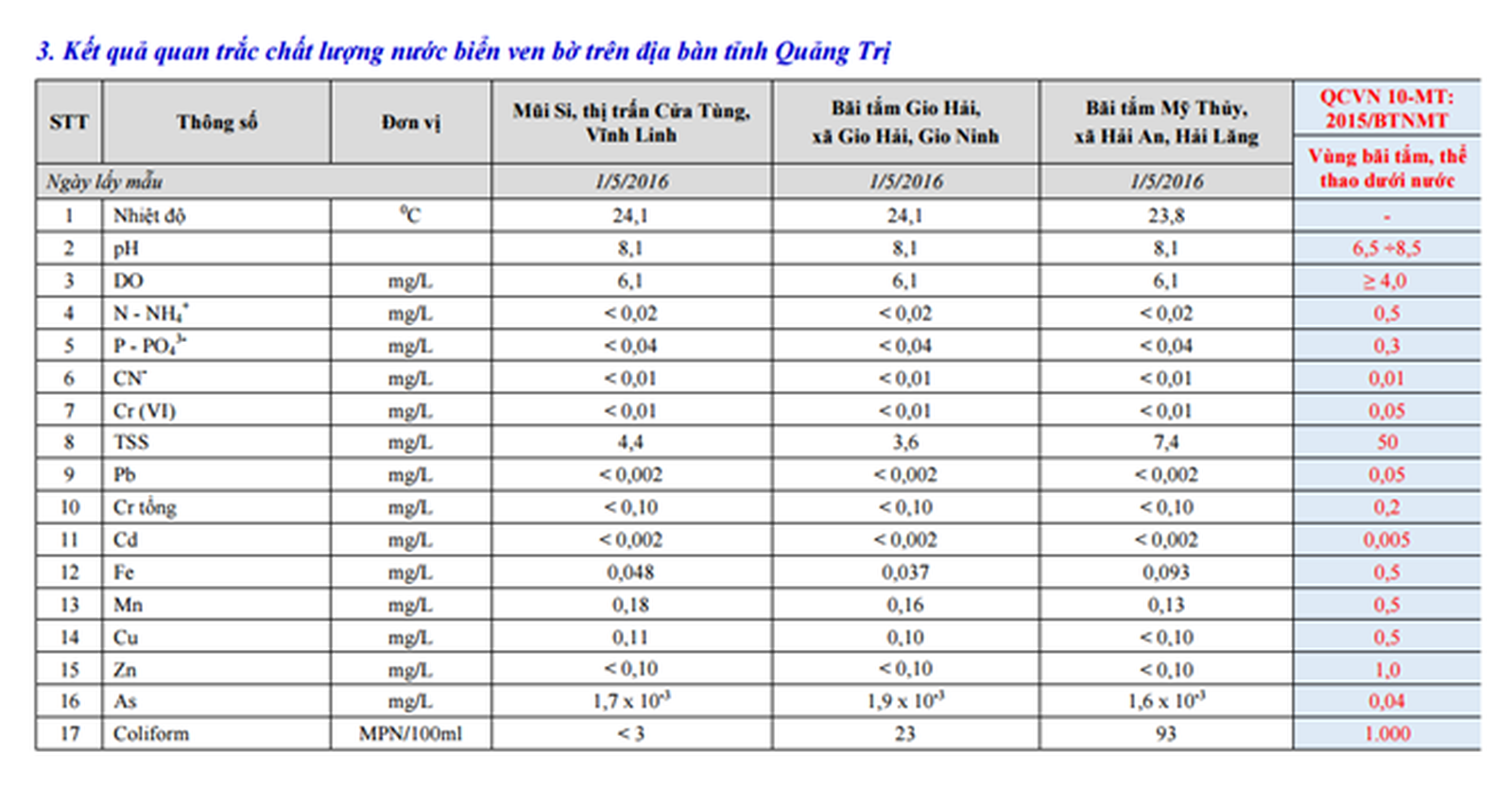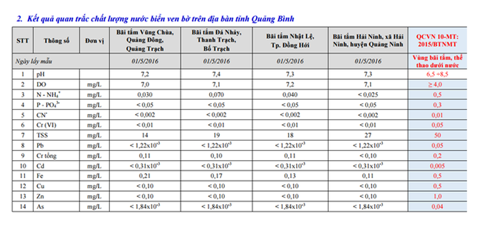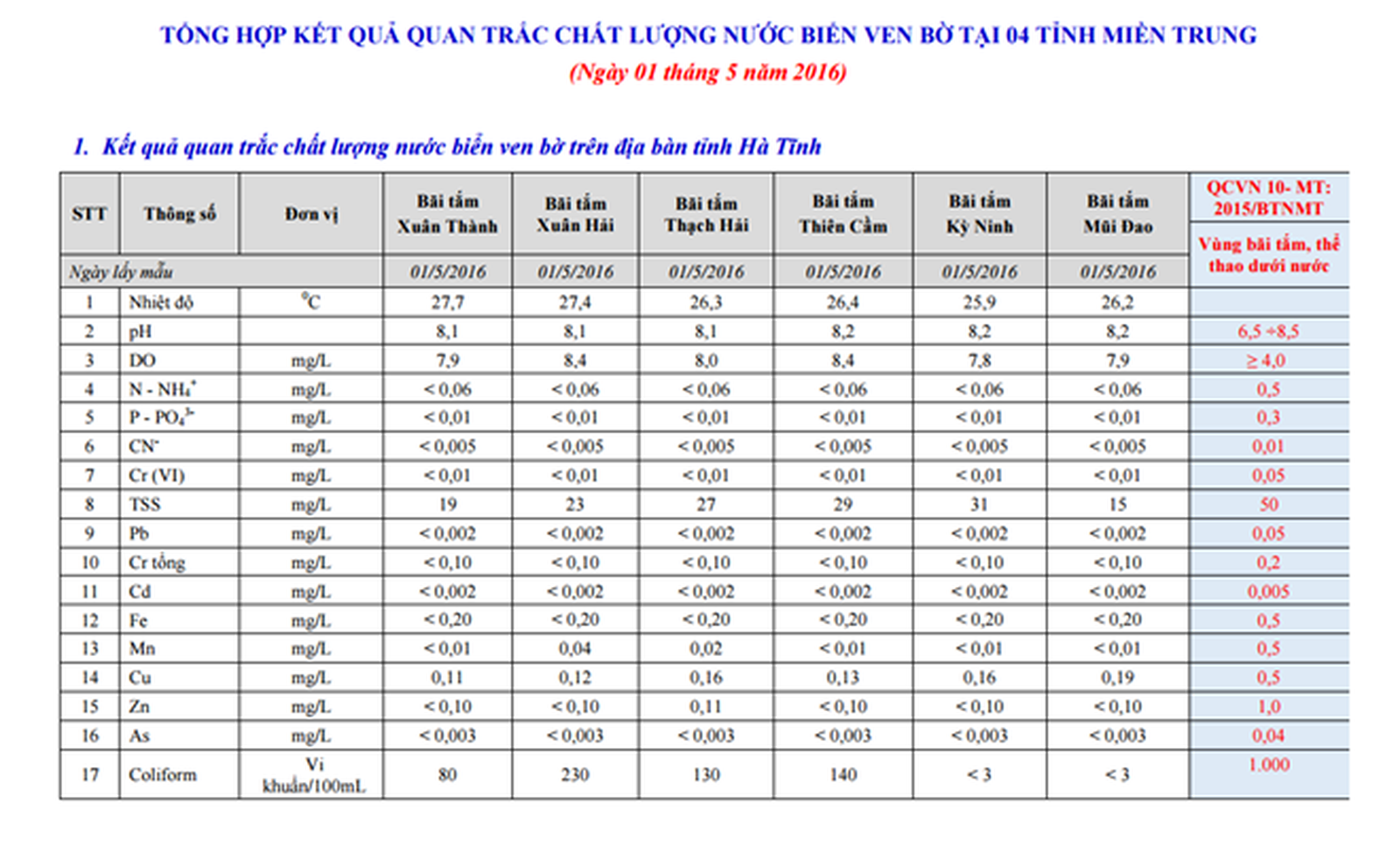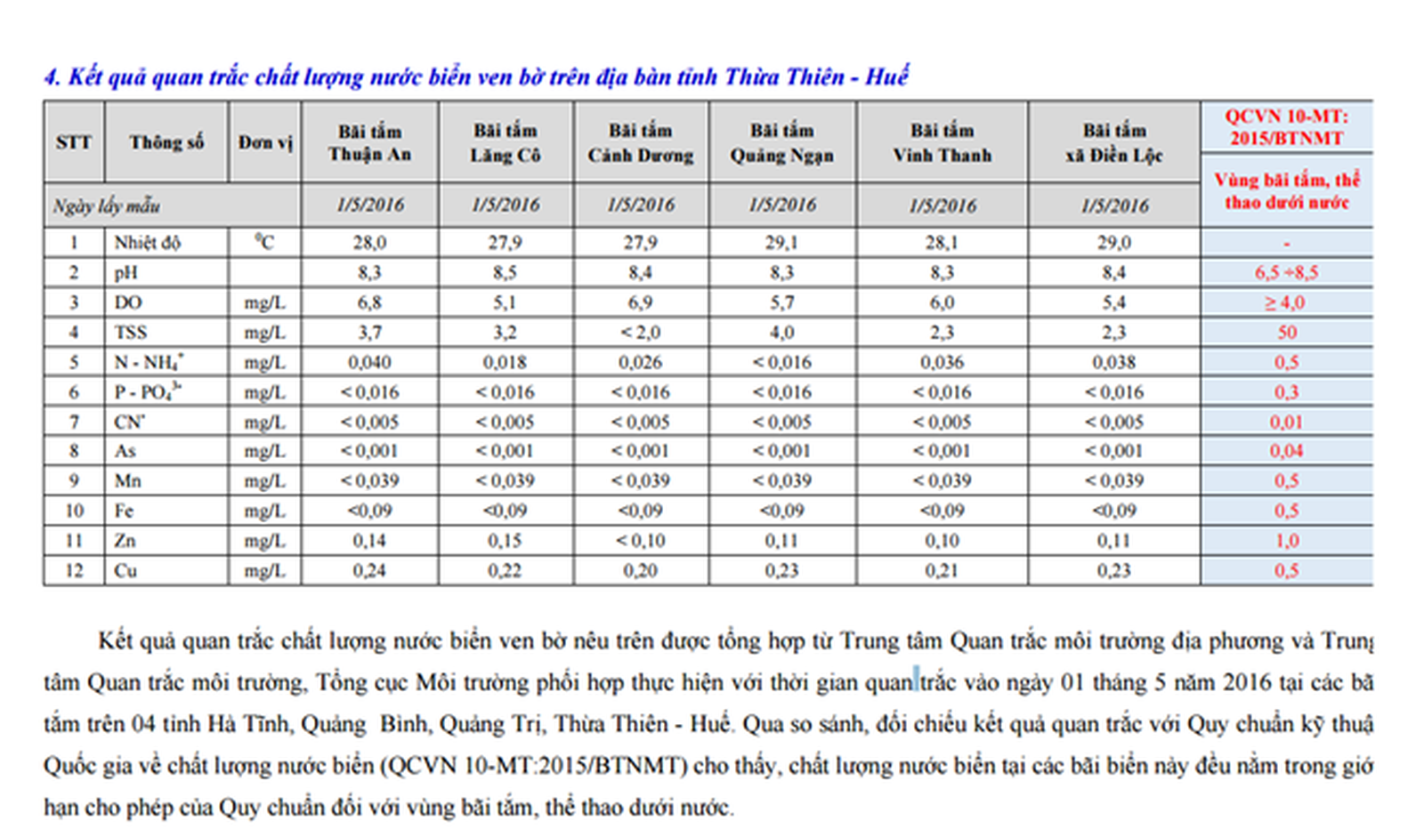 Qua so sánh, đối chiếu kết quả quan trắc với Quy chuẩn kỹ thuật Quốc gia về chất lượng nước biển (QCVN 10-MT:2015/BTNMT) cho thấy, chất lượng nước biển tại các bãi tắm trên đều nằm trong giới hạn cho phép của Quy chuẩn đối với vùng bãi tắm, thể thao dưới nước.
