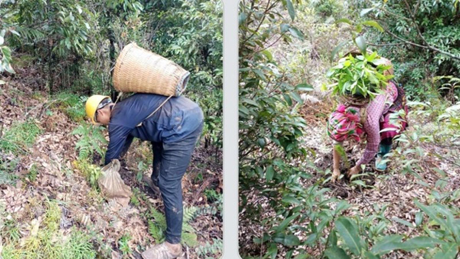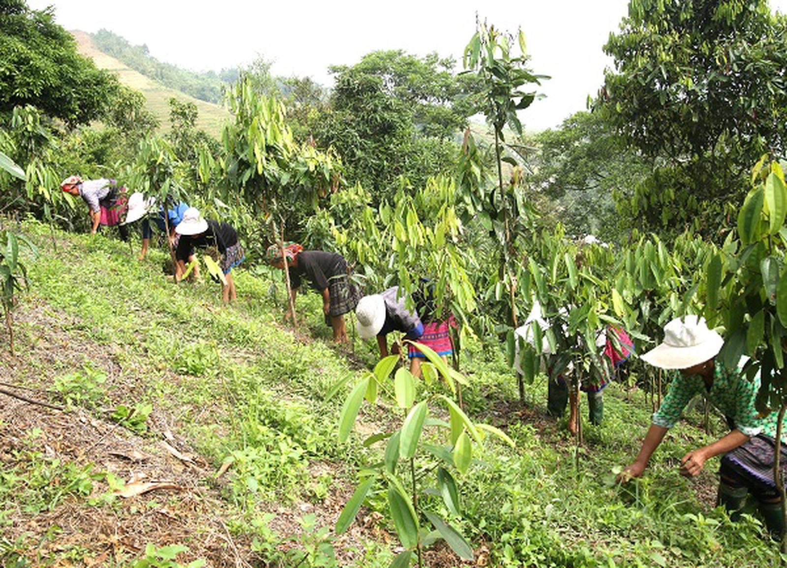 Người Mông thôn Khe Táu, xã Phong Dụ Thượng, huyện Văn Yên chăm sóc cây quế. Ảnh: Hoàng Yên
