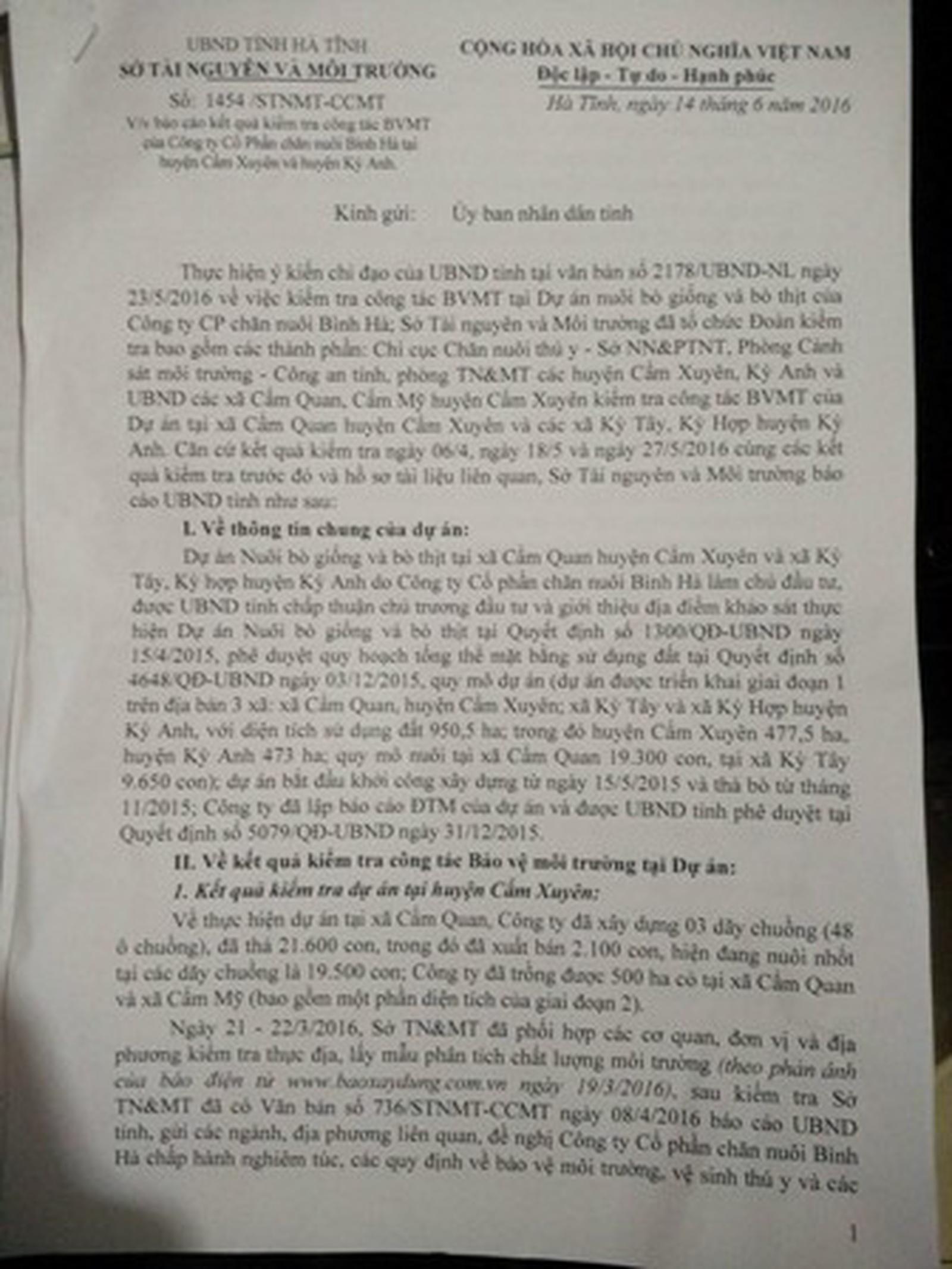 Quyết định số 1454/ STNMT – CCMT, báo cáo kết quả kiểm tra công tác BVMT của Cty Bình Hà sau khi có thông tin phán ánh tình trạng ô nhiễm môi trường nghiêm trọng tại huyện Cẩm Xuyên. Ảnh: Tăng Thành