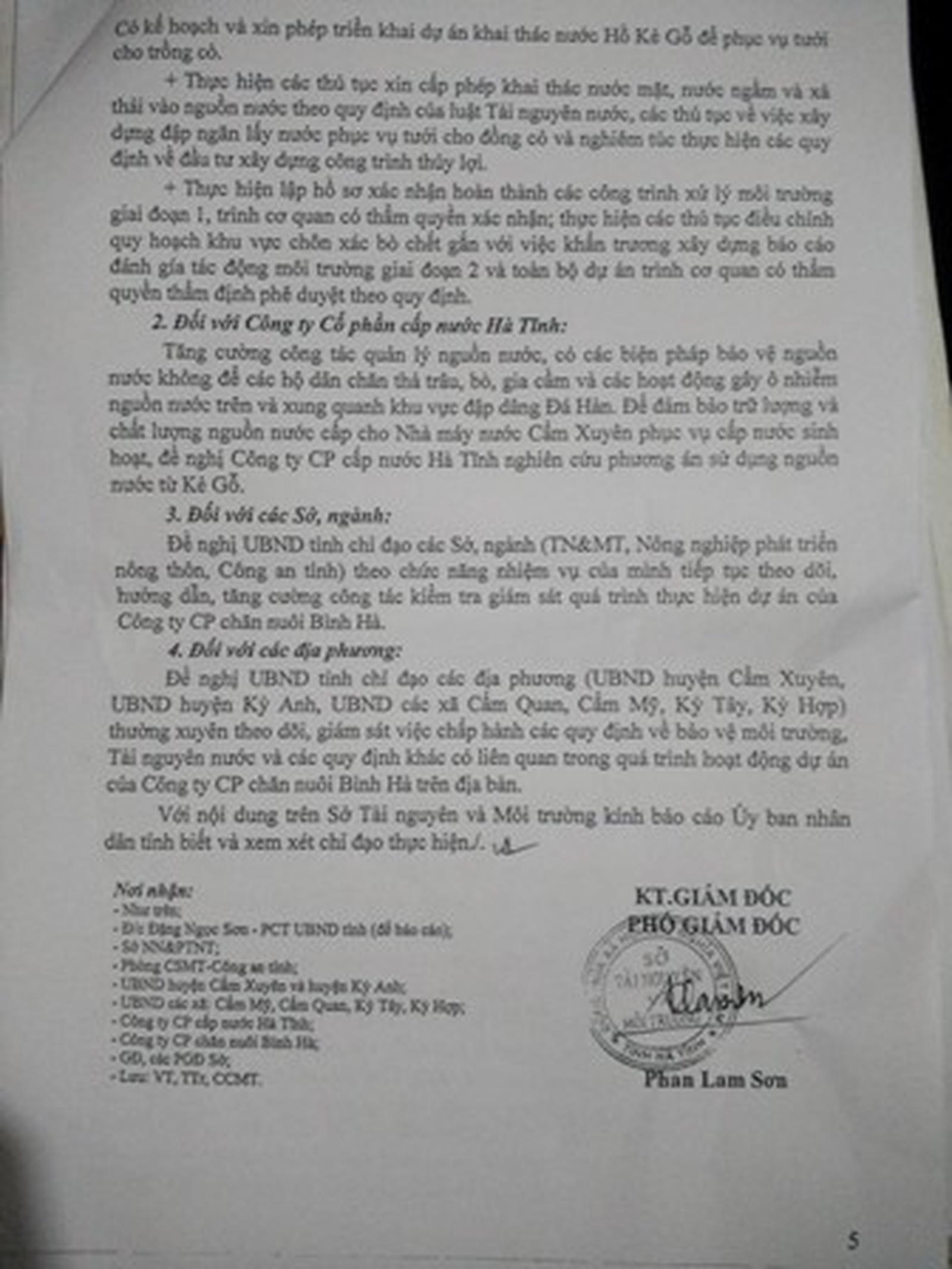 Sau khi nhận được thông tin trên, phía Sở TN&MT, ông Đặng Bá Lục, Chi cục trưởng Sở TN&MT Hà Tĩnh không khỏi giật mình. Ông Lục cho biết: Dự án chăn nuôi của Cty Bình Hà là dự án chăn nuôi tập trung số lượng lớn gần 30.000 con bò cả hai điểm thuộc huyện Cẩm Xuyên và huyện Kỳ Anh. Sau khi vấn đề ô nhiễm môi trường xảy ra trên địa bàn huyện Cẩm Xuyên, Sở TN&MT đã chủ trì cùng các sở, ban, ngành liên quan yêu cầu Công ty khắc phục. Đồng thời, tham mưu UBND tỉnh theo đúng thẩm quyền xử phạt Công ty 140 triệu đồng ngày 12/05/2016. Mặt khác, cơ quan chức năng đã cho Công ty thời hạn 1 tháng để khắc phục tình trạng trên. Ông Lục cũng khẳng định: Hiện tại, nếu Cty Bình Hà tái vi phạm chúng tôi sẽ tiến hành kiểm tra và xử lý nghiêm minh.