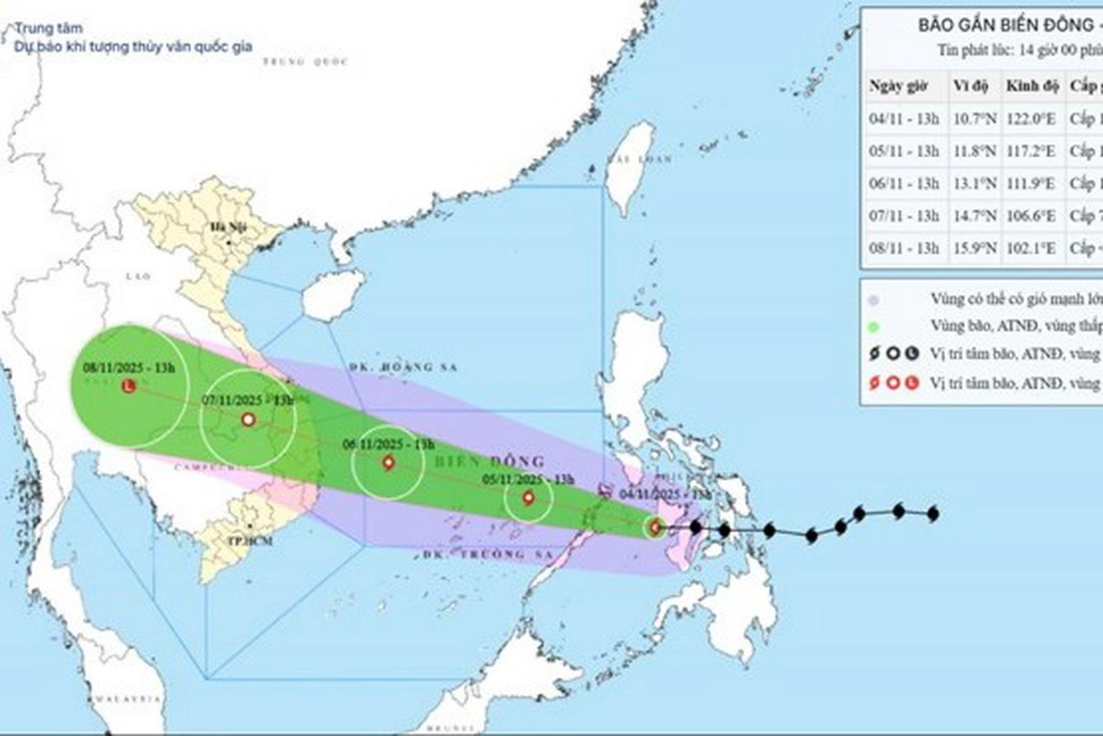 Cập nhật vị trí và đường đi của bão Kalmaegi vào 14 giờ ngày 4/11. Nguồn: Trung tâm Dự báo Khí tượng thủy văn quốc gia