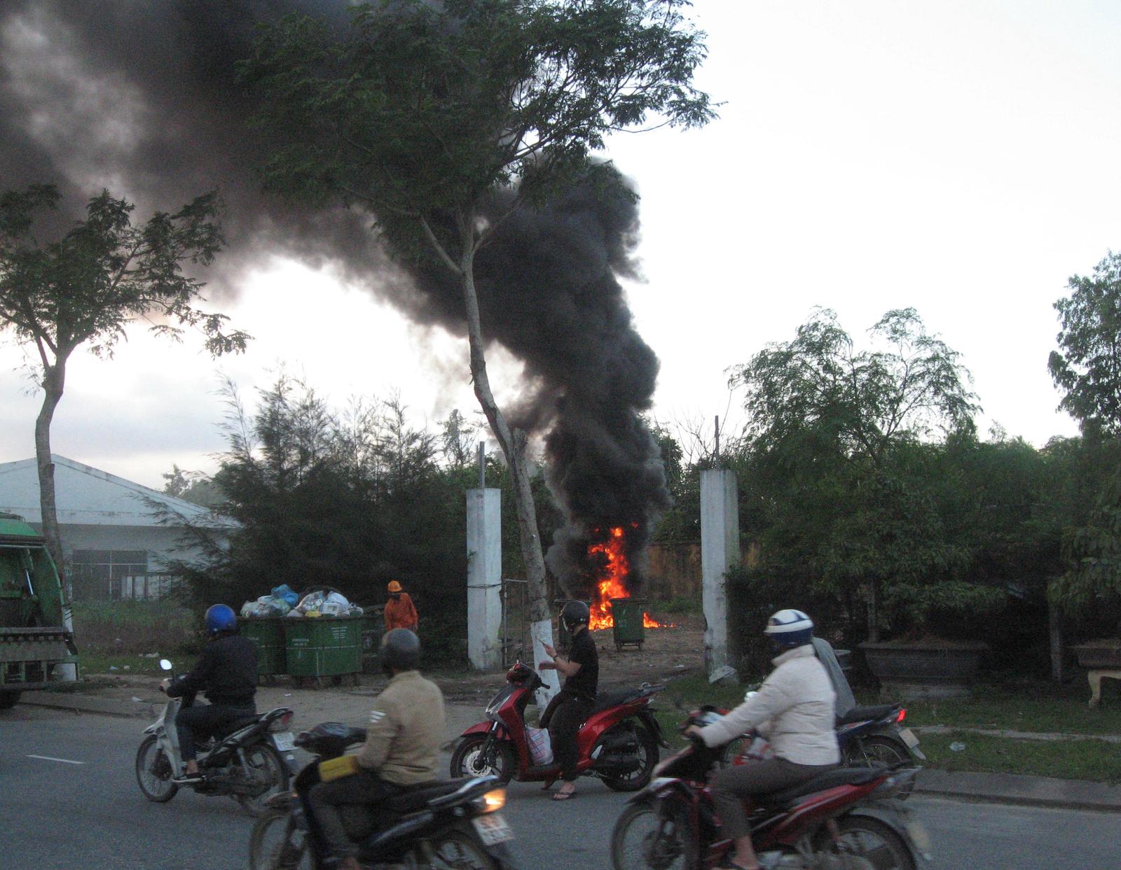 Vào thời gian trên, có một thanh niên mặc quần sọc, áo màu xanh châm lửa đốt đống rác nhựa to làm ngọn lửa bốc cao hơn chục mét, kéo theo khói đen nghịt vài chục mét, khét mùi hôi rồi theo gió rơi tàn vào nhà hàng, quán cơm và nhà ở của nhân dân trên đường Lê Đại Hành, buộc họ phải đóng cửa, kéo bạt và dùng khẩu trang...