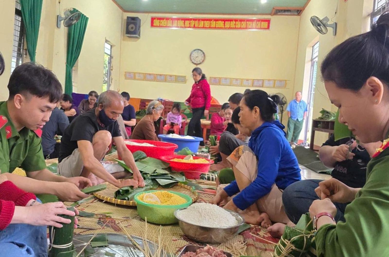 Người dân và cán bộ Công an tỉnh Đắk Lắk khẩn trương gói bánh chưng nhằm hỗ trợ đồng bào vùng lũ tại Đắk Lắk. Ảnh: CA
