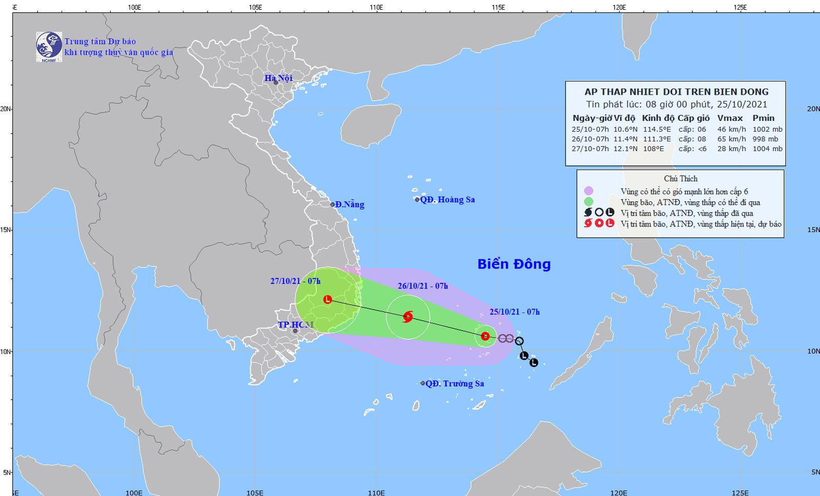 Dự báo trong 24 giờ tới, áp thấp nhiệt đới di chuyển chủ yếu theo hướng Tây Tây Bắc, mỗi giờ đi được khoảng 15km và có khả năng mạnh lên thành bão. Đến 7 giờ ngày 26/10, vị trí tâm bão ở khoảng 11,4 độ Vĩ Bắc; 111,3 độ Kinh Đông, cách bờ biển Bình Định đến Bình Thuận khoảng 230km về phía Đông. Sức gió mạnh nhất vùng gần tâm bão mạnh cấp 8 (60-75km/giờ), giật cấp 10.