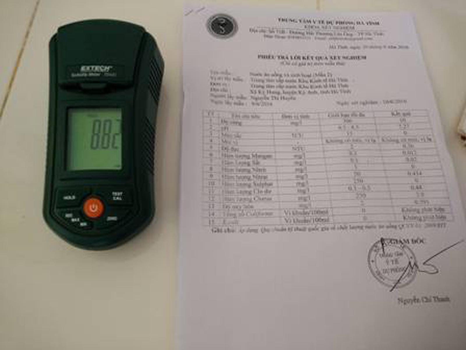 Để chứng minh cho nguồn nước mà người dân sinh hoạt hằng ngày luôn đảm bảo, an toàn và không hề bị ảnh hưởng bởi lượng rác thải mà Formosa chôn cất, ông Hoàng Tiến Dũng trực tiếp tiến hành đi lấy mẫu nước kiểm tra tại phòng hóa nghiệm của Trung tâm cấp nước. Qua quá trình thực nghiệm, độ đục khi chưa qua xử lý là 8,82 NTU và mẫu nước đã qua xử lý 0,22 NTU (Trong khi đó giới hạn tối đa là 2), hàm lượng Clo dư 0,50mg/l trong đó tiêu chuẩn tối đa từ 0.3 – 0.5, không phát hiện vi khuẩn Coliforms và E.coli và không có mùi vị lạ.